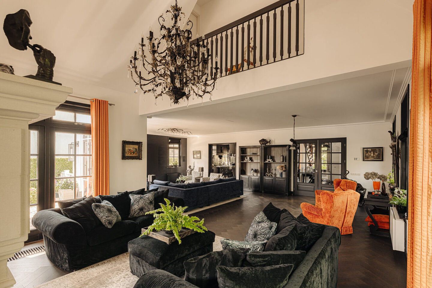 De woonkamer is ruim opgezet met meerdere zitgedeeltes, een fraai uitzicht op de tuin en het water en een karaktervolle zandstenen schouw met houthaard. De maatwerk eiken vloer in Hongaarse punt en de strak afgewerkte wanden en plafonds zorgen voor een stijlvolle uitstraling.