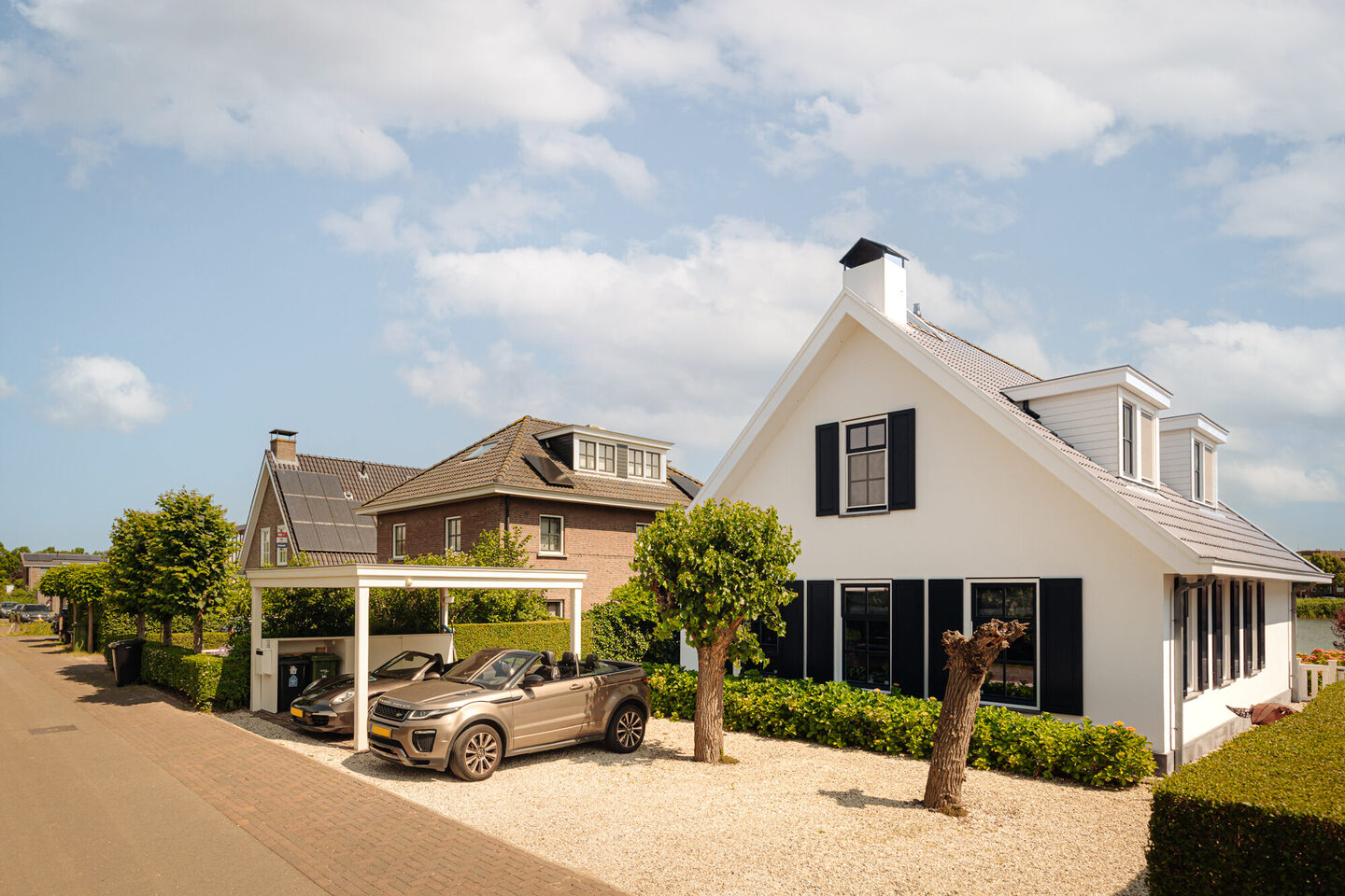 De verzorgde voortuin met carport en parkeergelegenheid voor meerdere auto’s leidt naar de representatieve entree van de woning.