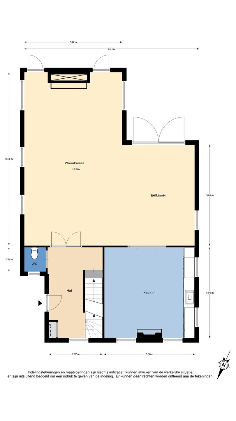 De ruime hal met vide vormt het centrale punt van het huis. Hier bevinden zich het toilet, de garderobe en de trap naar zowel de onderverdieping als de eerste verdieping. Vanuit de hal is er toegang tot de woonkamer en de woonkeuken.