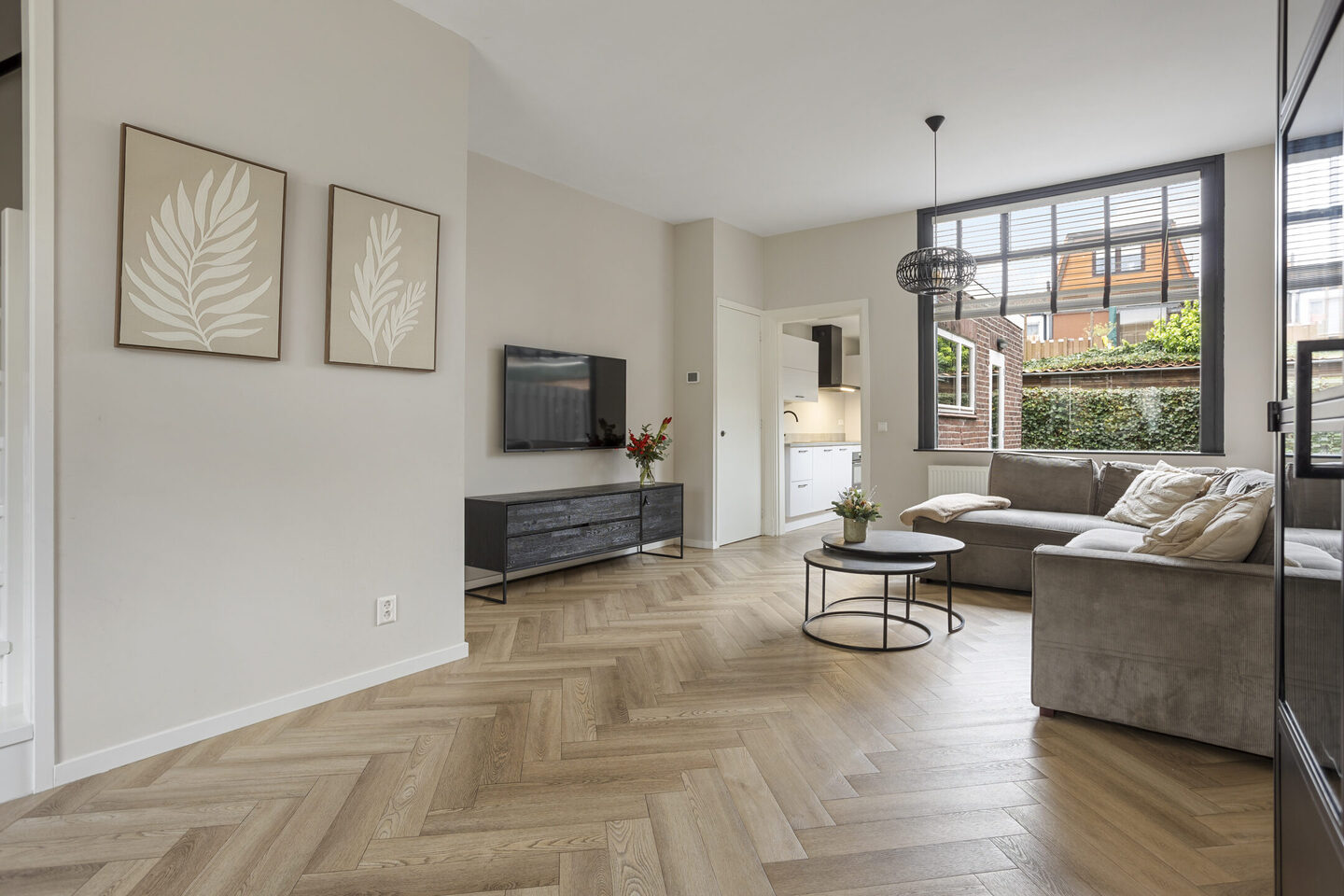 De compleet gerenoveerde, halfopen keuken is modern uitgevoerd en voorzien van diverse inbouwapparatuur, waaronder een inductiekookplaat, een combi oven/magnetron en een koel-vriescombinatie. Aan de achterzijde van de keuken bevindt zich het toilet met fonteintje.