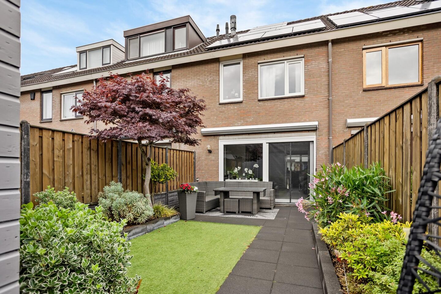 De zonnige achtertuin is bereikbaar via de schuifpui en gelegen op het zuidoosten. De tuin is fraai aangelegd en beschikt over een groot zonnescherm, een gezellig terras en een ruime houten berging met achterom.