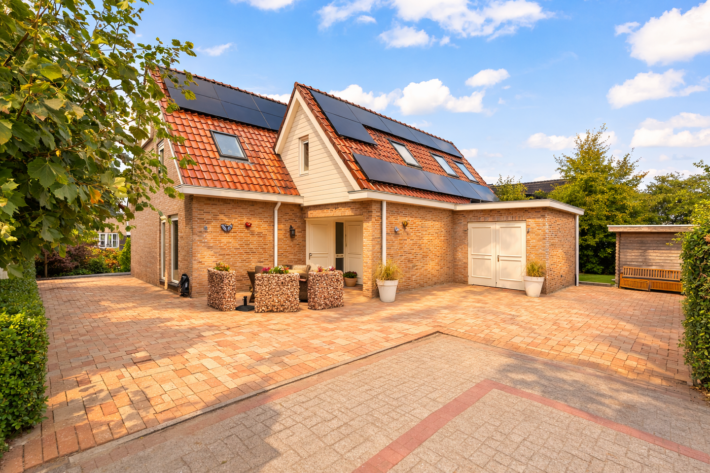 De fraai aangelegde achtertuin is een echte eyecatcher. De tuin beschikt over een onderheid betegeld terras, een verwarmd zwembad, een overkapping en een houten berging met filterpomp. Naast de berging staat een warmtepomp. Aan het water ligt een grote vlonder waar u heerlijk kunt genieten van de zon en het uitzicht. Daarnaast is er een zonnescherm aanwezig en liggen er maar liefst 30 zonnepanelen op het dak.