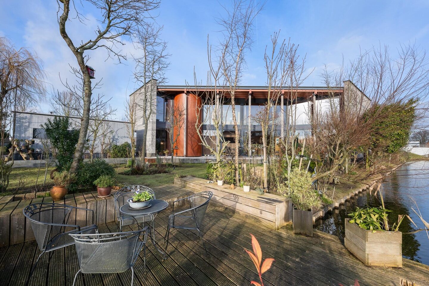 Velen kennen de achterkant van dit huis niet, maar zijn al wel vaak langs dit huis gereden! Wat een ontzettend gaaf object. Met een gebruiksoppervlakte van 225 m2 ligt dit vrijstaande huis op een eigen eiland van 871 m2 (eigen) grond. Het huis is door architecten ontworpen en in juli 2009 opgeleverd. Het is zeer onderscheidend qua indeling en architectuur. Vooral de grote glaspartijen op het zuidwesten met een prachtig uitzicht over de tuin en het water springen in het oog. Op de begane grond is een living met een hoog plafond, een keuken met een gezellig eetgedeelte en een bijkeuken. Een verdieping hoger zijn een werkplek, drie slaapkamers en twee badkamers aanwezig. De grote tuin is ingericht met diverse zitjes, waaronder op het onderheide terras. Aan de waterkant is een vlonder te vinden en er is een 15 m2 grote berging aanwezig. Uiteraard is het hier ook mogelijk om een bootje aan te leggen.
