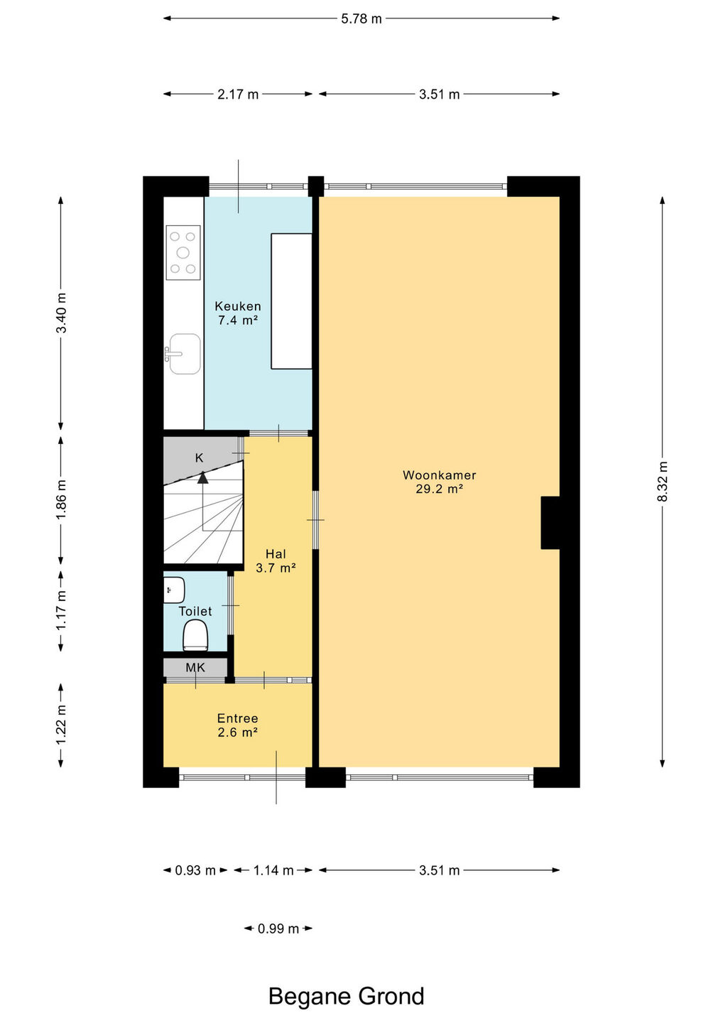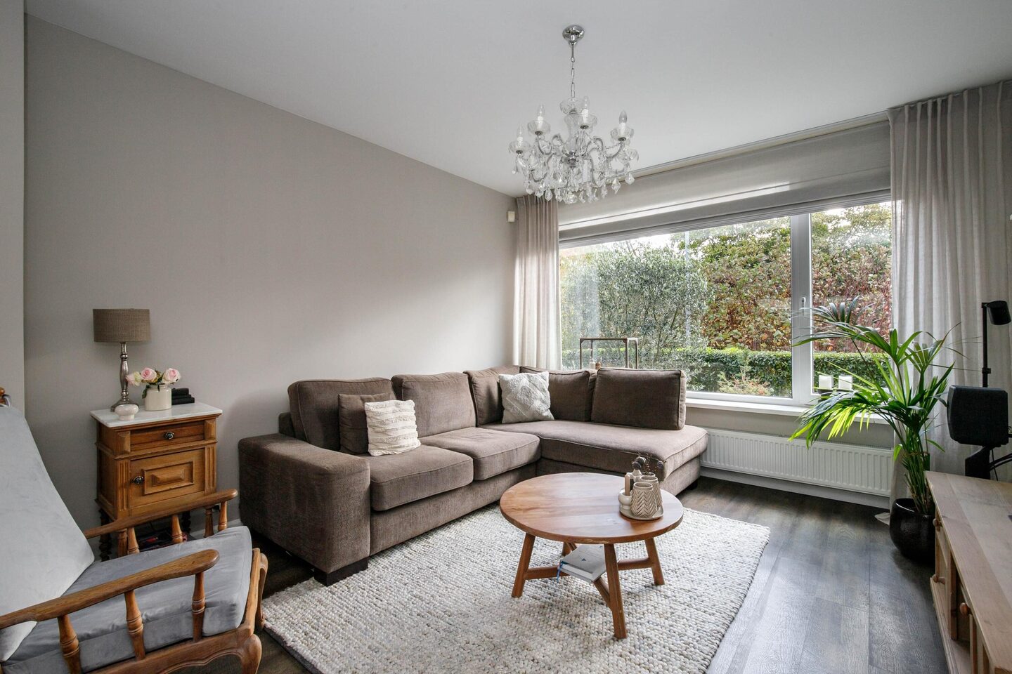 Bij binnenkomst in de lichte entree vind je de meterkast, garderobe, het moderne toilet met fonteintje en de praktische trapkast. Vanuit de hal bereik je de ruime doorzonwoonkamer, die door de grote ramen aan zowel de voor- als achterzijde geniet van veel daglicht. De elektrische screens zorgen voor een aangenaam binnenklimaat in de zomer.