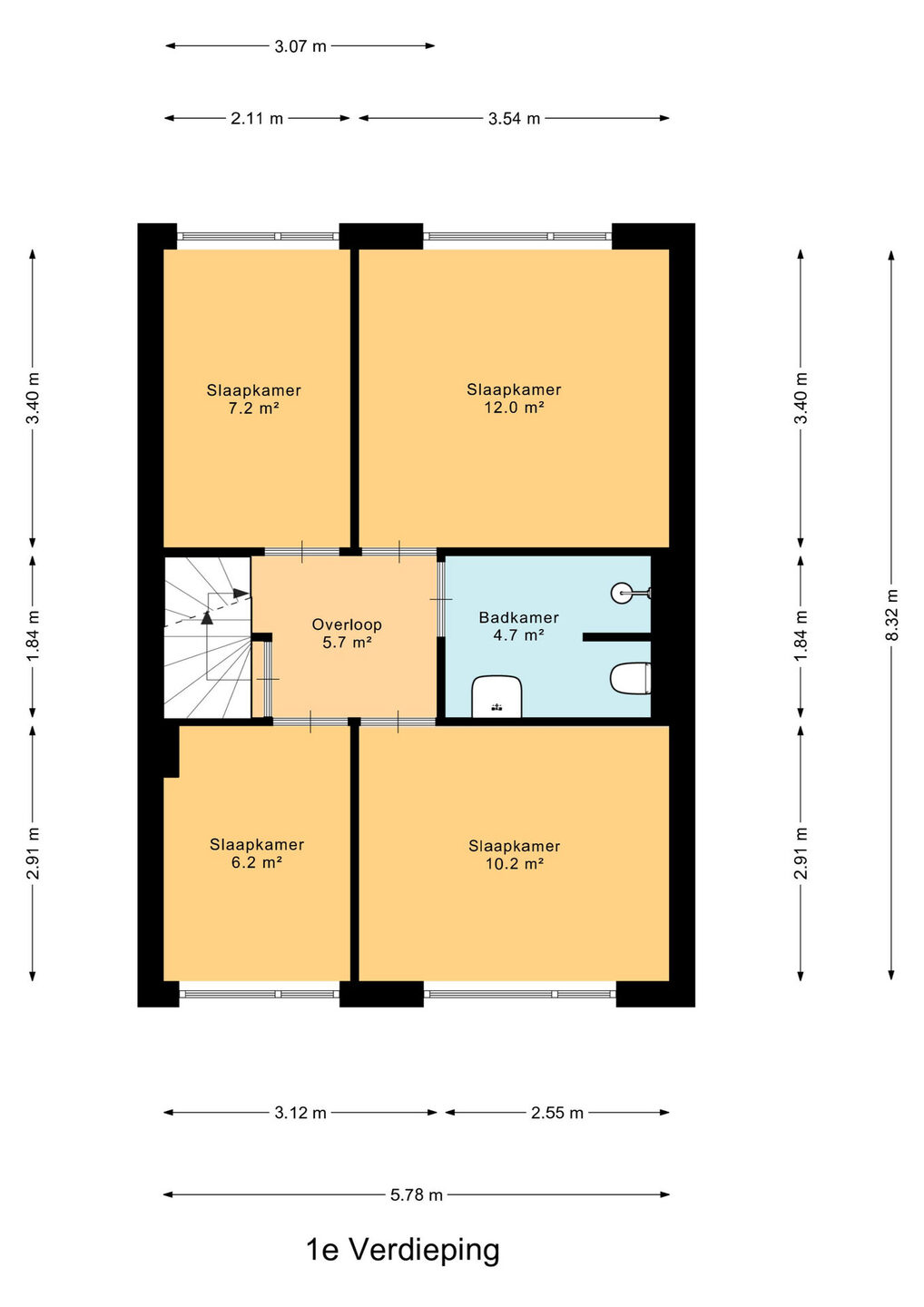 Op de eerste verdieping vind je vier goed bemeten slaapkamers, verdeeld over de voor- en achterzijde van de woning. De recent gerenoveerde badkamer is centraal gelegen en modern afgewerkt met een ruime inloopdouche, zwevend toilet en een stijlvol wastafelmeubel. De gehele verdieping is voorzien van laminaatvloeren en kunststof kozijnen met dubbel glas.