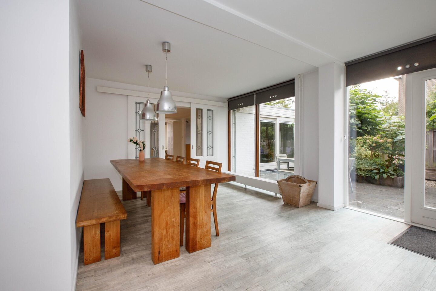 Grenzend aan de keuken bevindt zich de lichte eetkamer/woonkamer. Dubbele deuren verbinden deze ruimte op natuurlijke wijze met de achtertuin, terwijl authentieke schuifdeuren leiden naar de royale aanbouw van maar liefst 41 m². Dankzij de schuifpui en twee lichtkoepels zijn deze ruimtes voorzien van veel daglicht. Ooit een garage, nu een veelzijdige plek die perfect dienst kan doen als extra woonkamer, speelkamer, kantoor- of praktijkruimte.