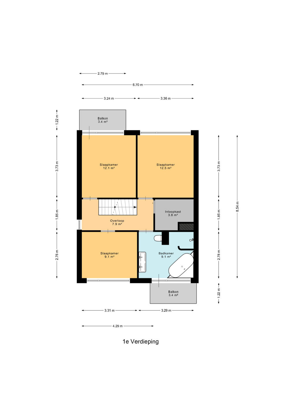 Via de overloop bereik je drie slaapkamers, een inloopkast en de badkamer. Aan de voorzijde ligt een van de slaapkamers. Aan de achterzijde bevinden zich nog twee slaapkamers, waarvan één directe toegang biedt tot een balkon. Dit maakt de kamer niet alleen licht en ruimtelijk, maar ook extra aantrekkelijk in de zomermaanden. De inloopkast bevindt zich naast de grootste slaapkamer.