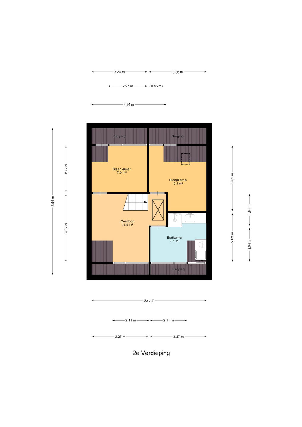 De tweede verdieping weet je aangenaam te verrassen met zijn ruimte en praktische indeling. Aan de voorzijde zorgt de dakkapel (geplaatst in 2006) voor extra licht en een ruimtelijk gevoel, terwijl de knieschotten slim zijn benut om volop bergruimte te creëren. Op deze verdieping bevindt zich bovendien een tweede badkamer, compleet met wastafelmeubel, douche en aansluiting voor de wasmachine.