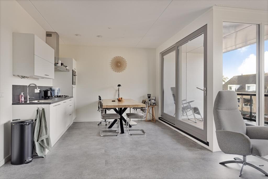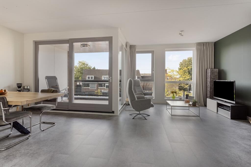 De woonkamer is voorzien van veel natuurlijke licht door de grote raampartijen. Ook de deur naar het balkon zorgt voor veel lichtinval en geeft toegang tot een ruim balkon op het noordwesten.