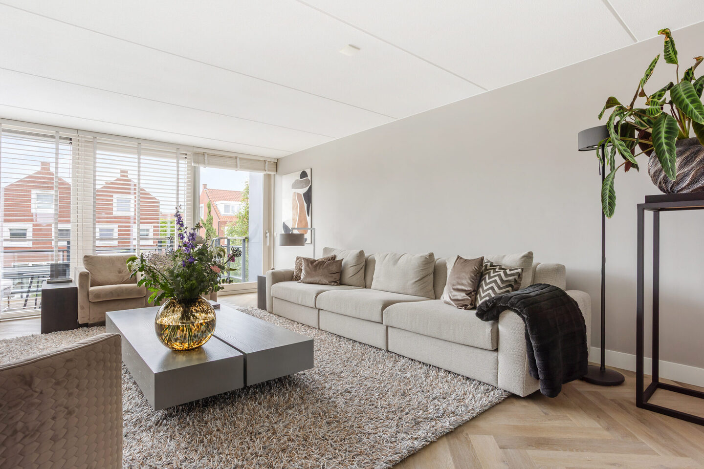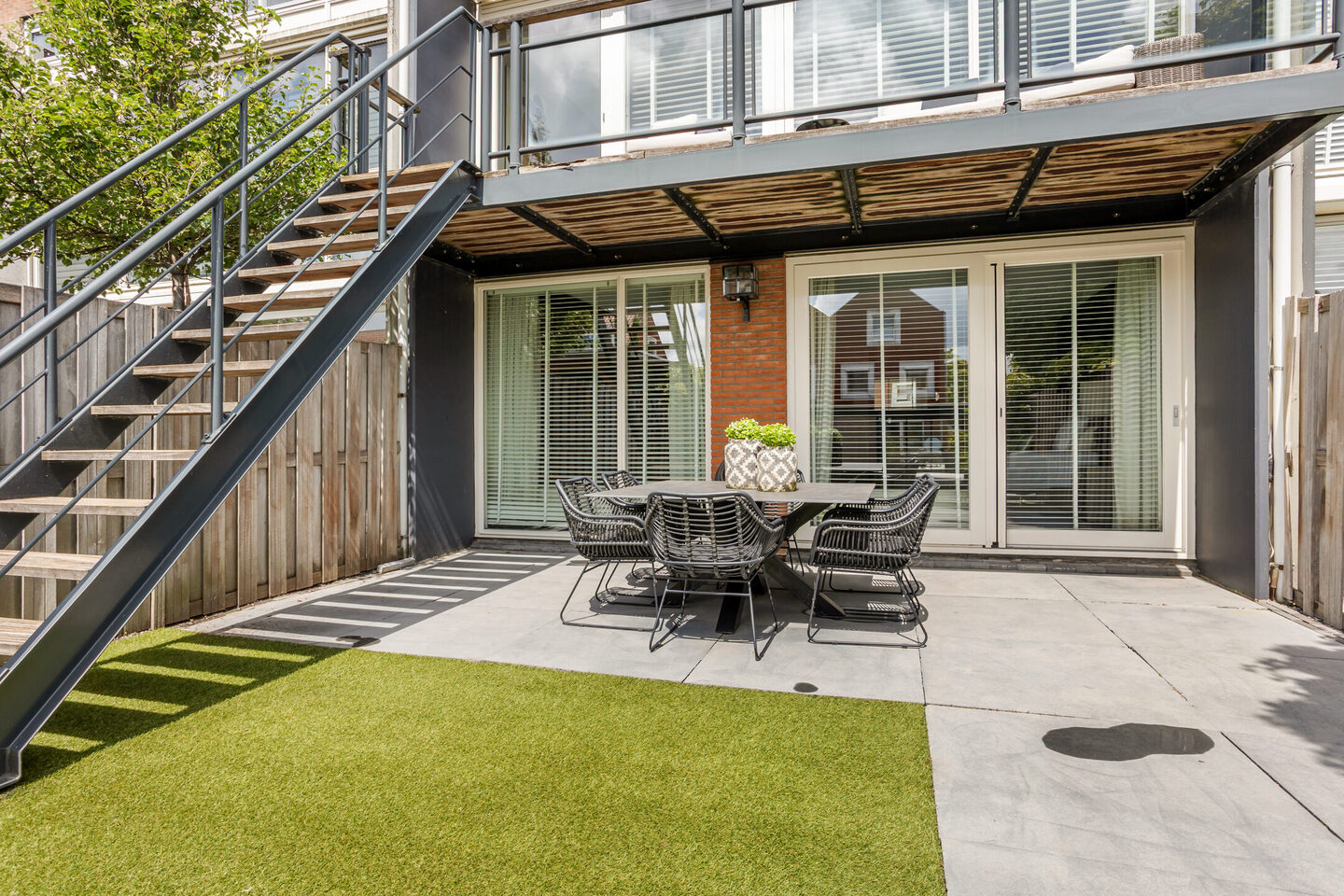 De ruime, lichte woonkamer heeft een grote raampartij en schuifpui. Via de schuifpui kom je op het royale terras voorzien van zonwering, waar je heerlijk kunt genieten van de avondzon. Vanaf het terras leidt een trap naar de achtertuin.