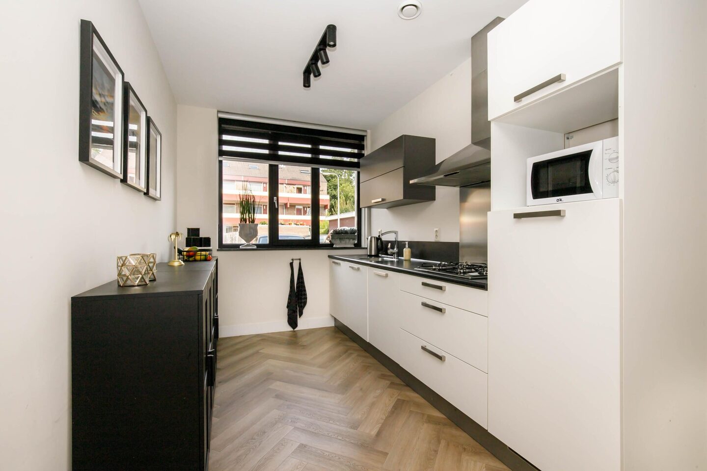 Aan de voorzijde vind je de open keuken. Deze is uitgerust met moderne inbouwapparatuur, waaronder een koelkast, vaatwasser, gaskookplaat en afzuigkap. Terwijl je staat te koken, kijk je gezellig uit over de straat.