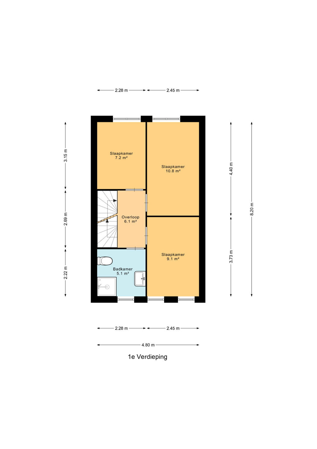 Op de eerste verdieping geeft de overloop toegang tot drie slaapkamers en de badkamer. Twee slaapkamers liggen aan de achterzijde en één aan de voorkant van het huis. De badkamer bevindt zich ook aan de voorzijde en is uitgerust met een inloopdouche, toilet en wastafel.