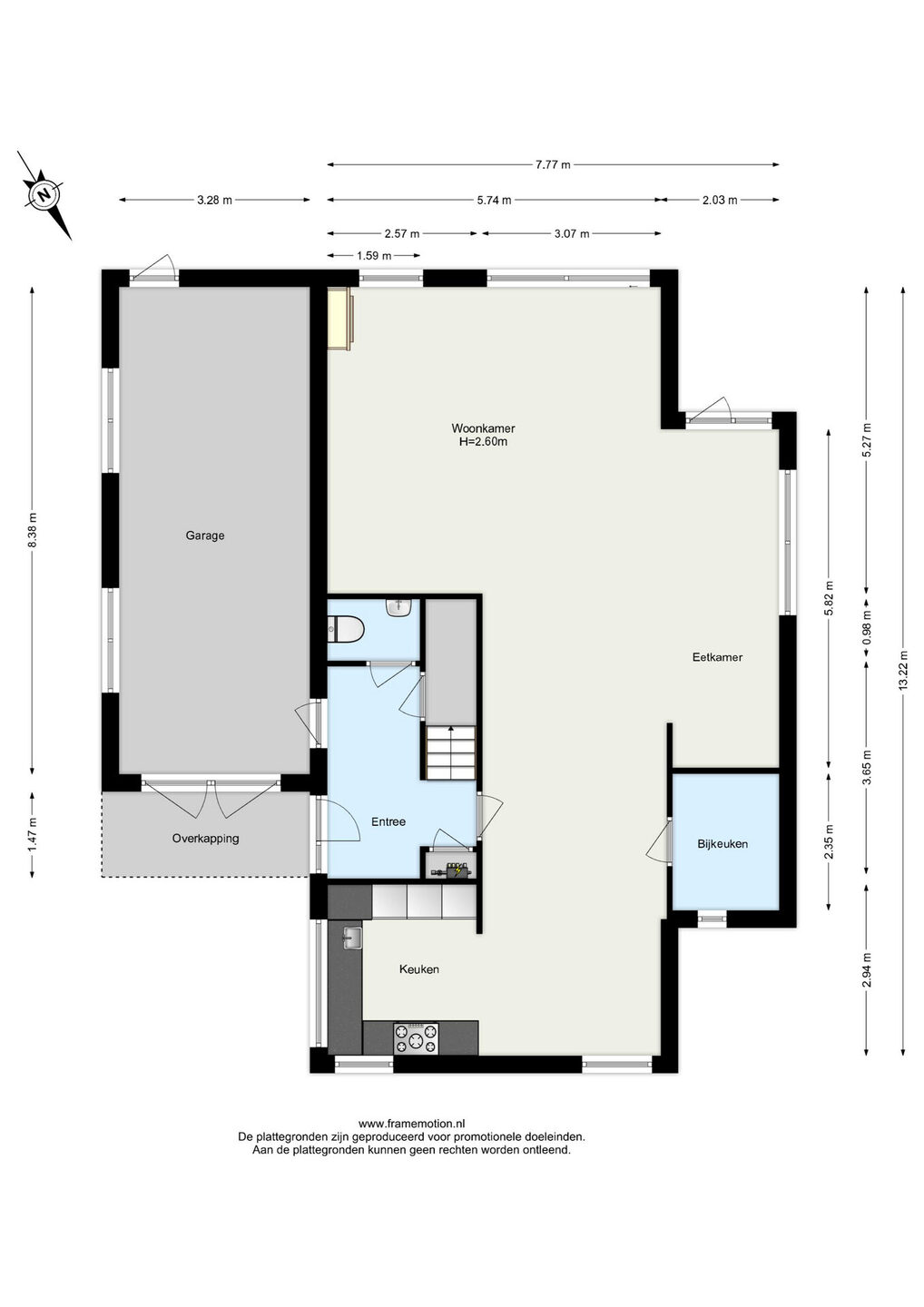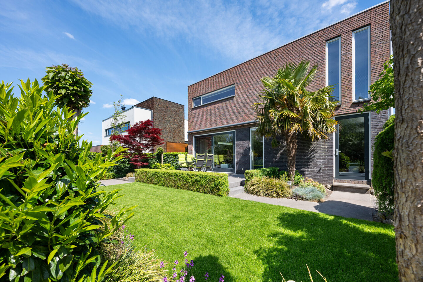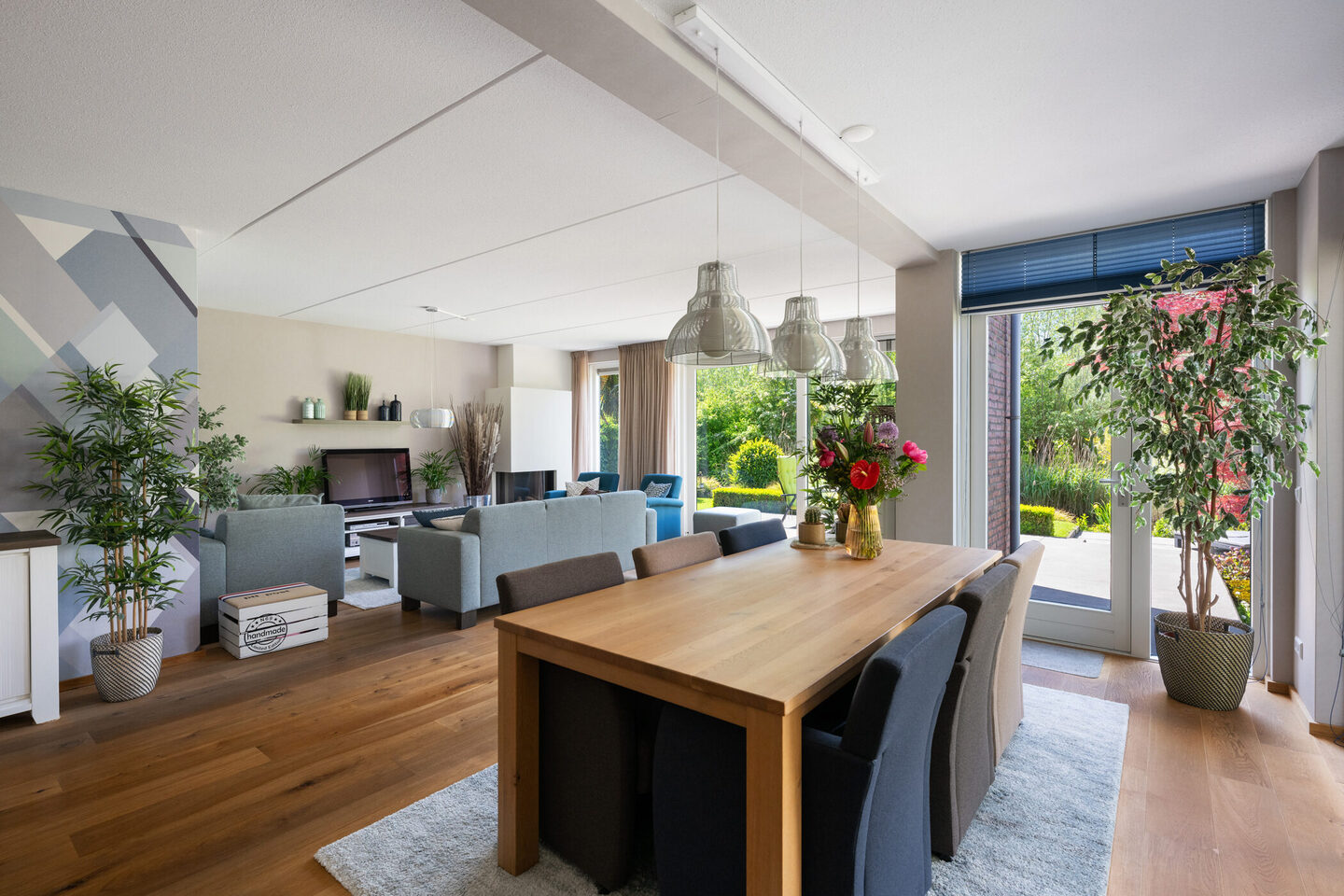 Binnenkomst via de ruime hal met meterkast en toilet met fonteintje. Vanuit de hal is de inpandige garage bereikbaar, voorzien van tegelvloer, verwarming, daglicht, dubbele deur aan de voorzijde en een deur naar de tuin. De sfeervolle woonkamer heeft een eikenhouten vloer, een gashaard, airco, schuifpui naar de tuin en een lichte zijaanbouw met deur naar de tuin en een nisje met werkhoek. De open keuken aan de voorzijde is voorzien van brede 5-pits inductiekookplaat (Siemens), afzuigkap, Miele koelkast en vriezer, Siemens combi oven/magnetron en AEG vaatwasser. Aansluitend is er een praktische bijkeuken.
