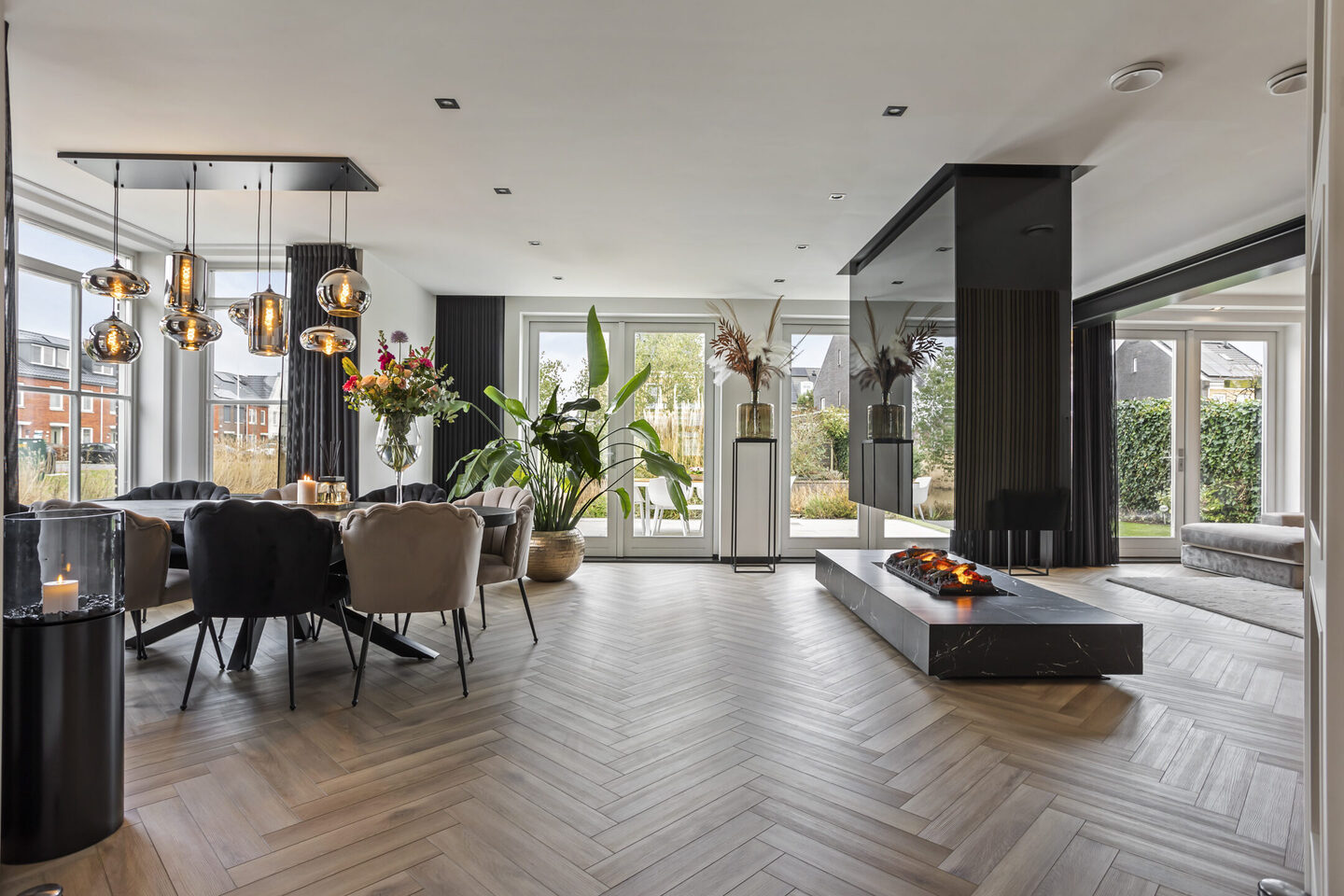 De tuingerichte woonkamer is bijzonder licht dankzij maar liefst drie dubbele deuren naar de achtertuin. De sfeervolle waterdamp-haard met licht- en ledverlichting zorgt voor een warme uitstraling zonder uitstoot.