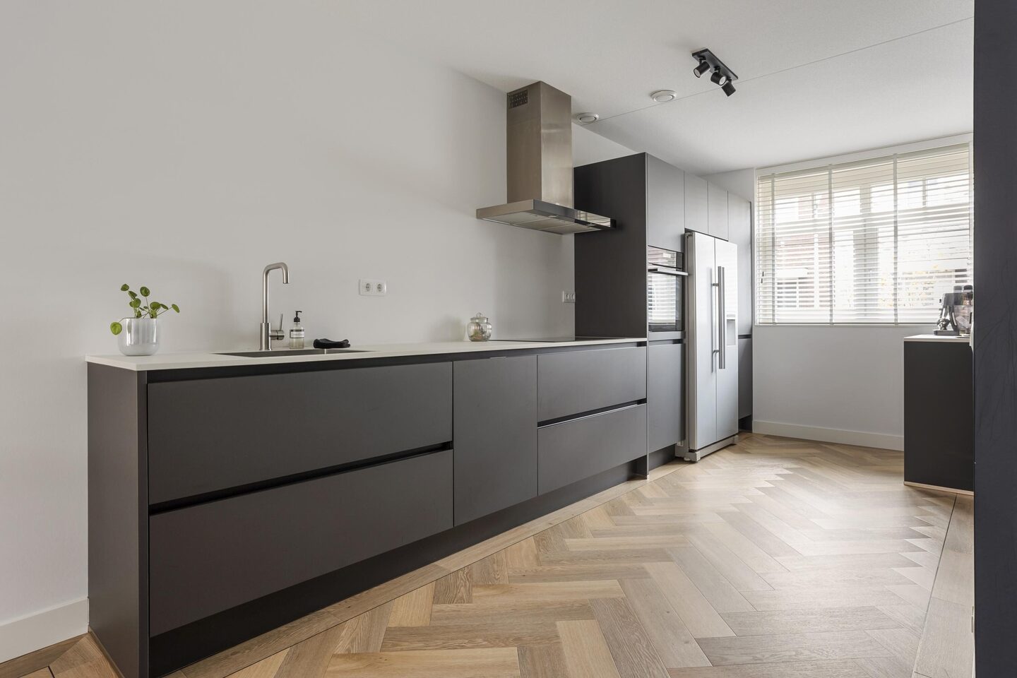De open keuken bevindt zich aan de voorzijde van de woning en is voorzien een keramieken blad en diverse inbouwapparatuur, zoals een 4-pits inductiekookplaat, een afzuigkap, een vaatwasser, een stoomoven en een Amerikaanse koelkast. Extra opbergruimte is er gecreëerd met de kast onder de trap.