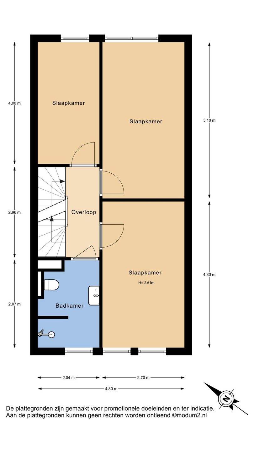 Overloop met toegang tot drie slaapkamers, waarvan er twee zijn gelegen aan de achterzijde van de woning. De derde slaapkamer is, eveneens als de badkamer, gelegen aan de voorzijde van de woning. Alle drie de slaapkamers zijn ruim.