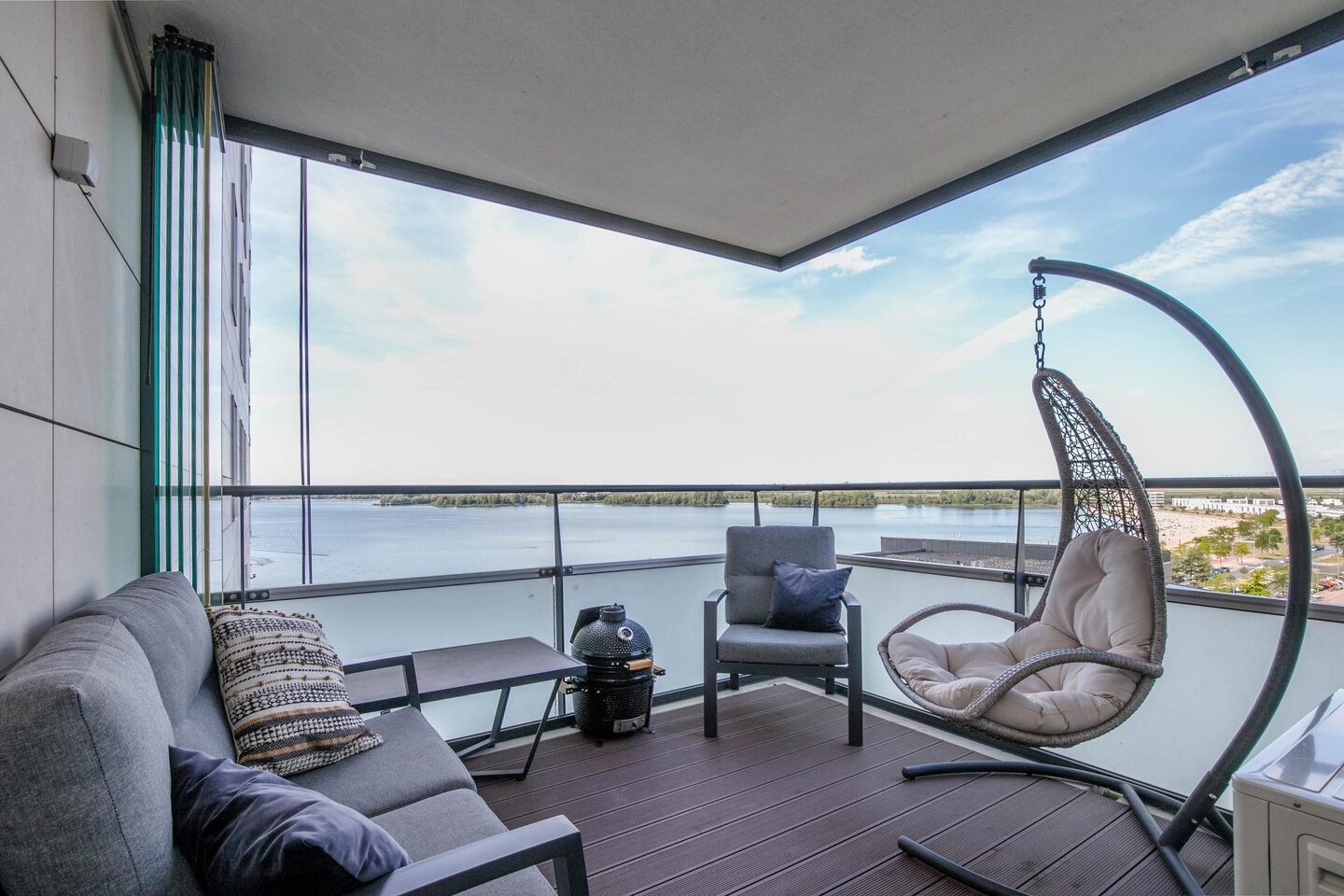 Het ruime balkon van ruim 10 m² is afsluitbaar met een glazen schuifwand, zodat u hier zowel zomers als in de koudere maanden comfortabel kunt genieten van het fenomenale uitzicht over de Zevenhuizerplas.