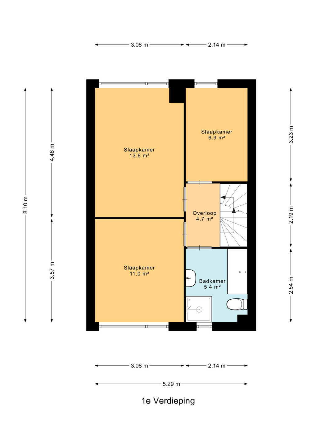 Op de eerste verdieping bevinden zich drie slaapkamers: twee aan de achterzijde en één aan de voorzijde. De ruime badkamer is uitgevoerd in de originele indeling en voorzien van een wastafel, douche, ligbad en toilet.