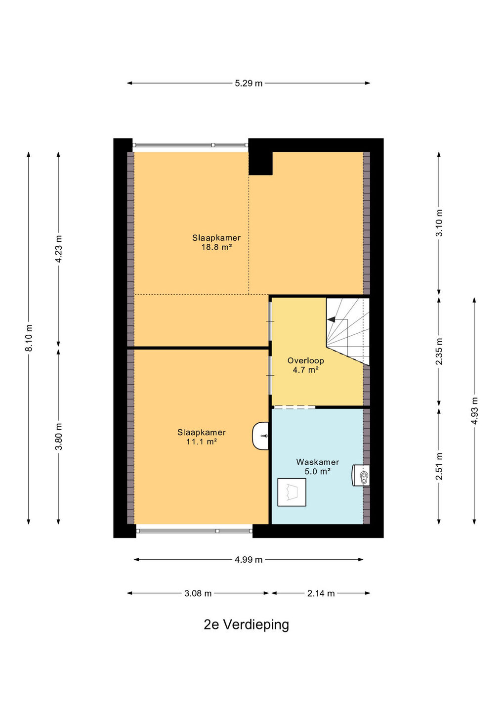 De tweede verdieping biedt verrassend veel ruimte. Aan de achterzijde bevindt zich een royale slaapkamer met een hoog, schuin plafond, sfeervolle balken en extra opbergruimte op de open vliering. Een plek met karakter en charme. Aan de voorzijde ligt een extra slaapkamer met wastafel; ook deze kamer is sfeervol door het hoge, schuine plafond met balken. Daarnaast is er een praktische bergruimte (wasruimte) met de cv-ketel en de aansluiting voor de wasmachine. Deze ruimte biedt bovendien de mogelijkheid om een tweede badkamer te realiseren; de afvoer en de watertoevoer zijn al keurig voorbereid, vergelijkbaar met de badkamer op de eerste verdieping.