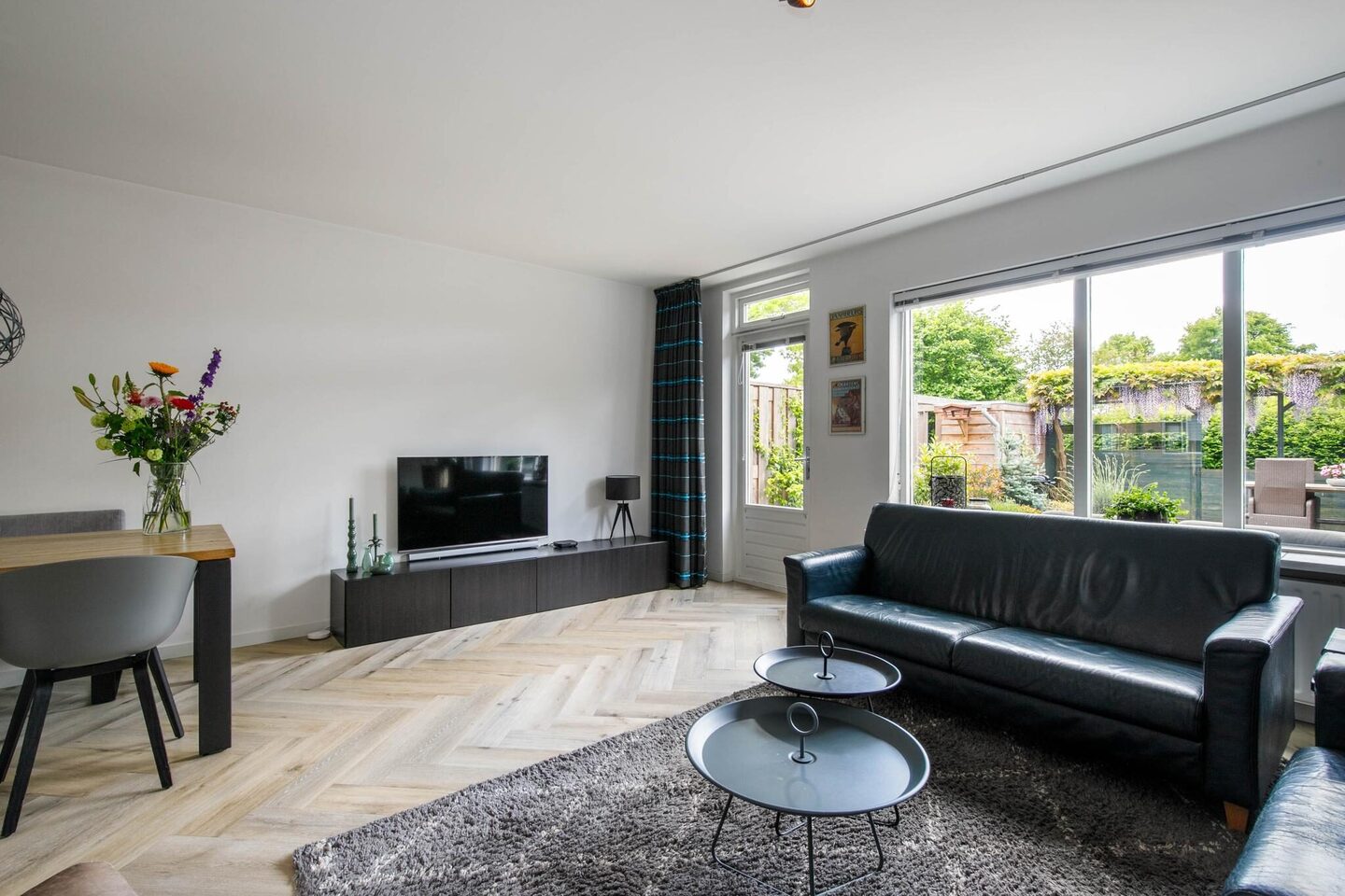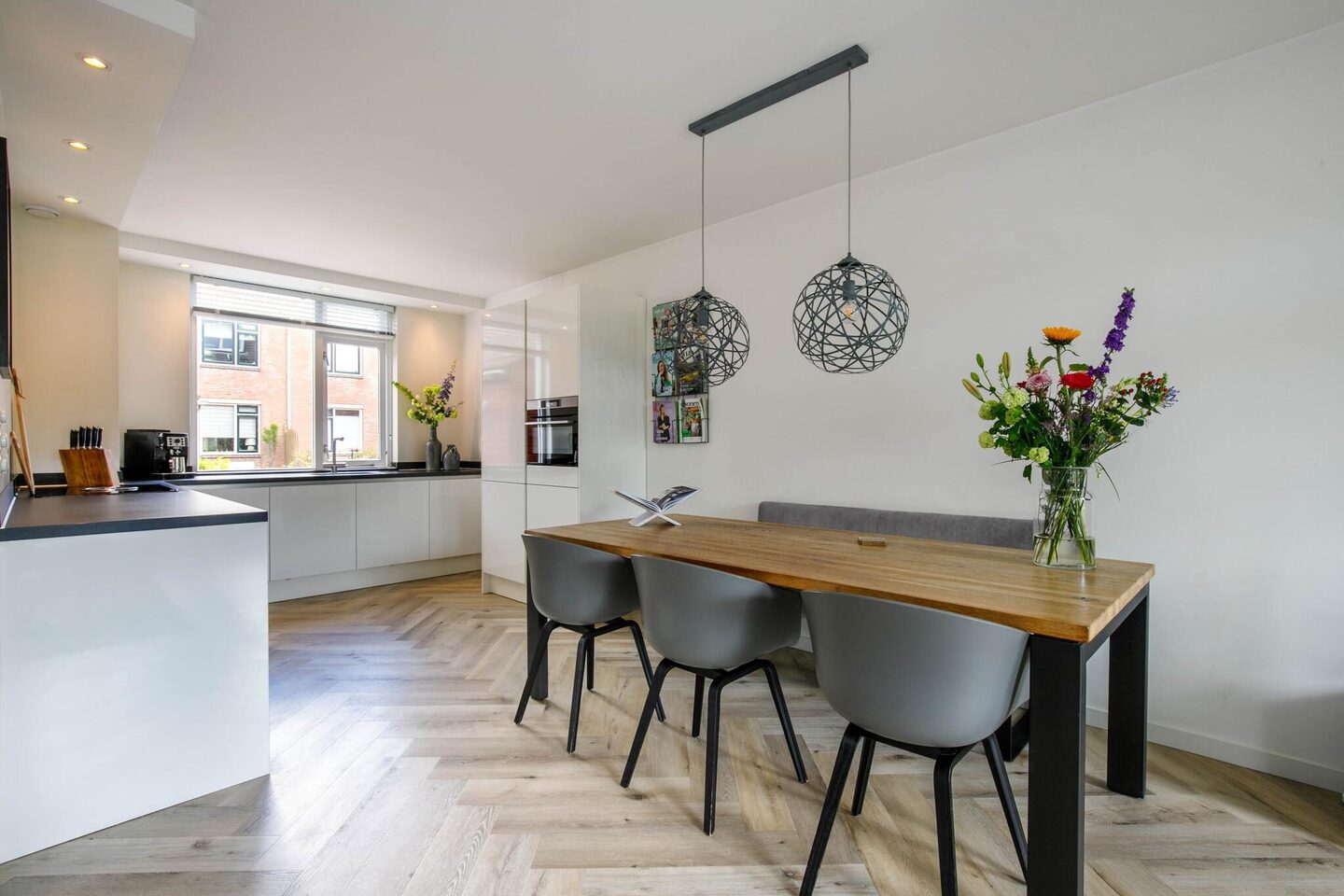 De tuingerichte woonkamer heeft een gezellige zithoek. De grote raampartijen zorgen ervoor dat de ruimte van veel daglicht wordt voorzien. In de doorloop naar de keuken aan de voorzijde is ruimte voor een royale eethoek. De moderne open keuken is in 2019 gemoderniseerd en is voorzien diverse inbouwapparatuur zoals; een koel-vriescombinatie, vaatwasser, oven, inductiekookplaat met geïntegreerde afzuigkap en een Quooker. Door de L-opstelling en de extra hoge kasten is er veel bergruimte in de keuken aanwezig.