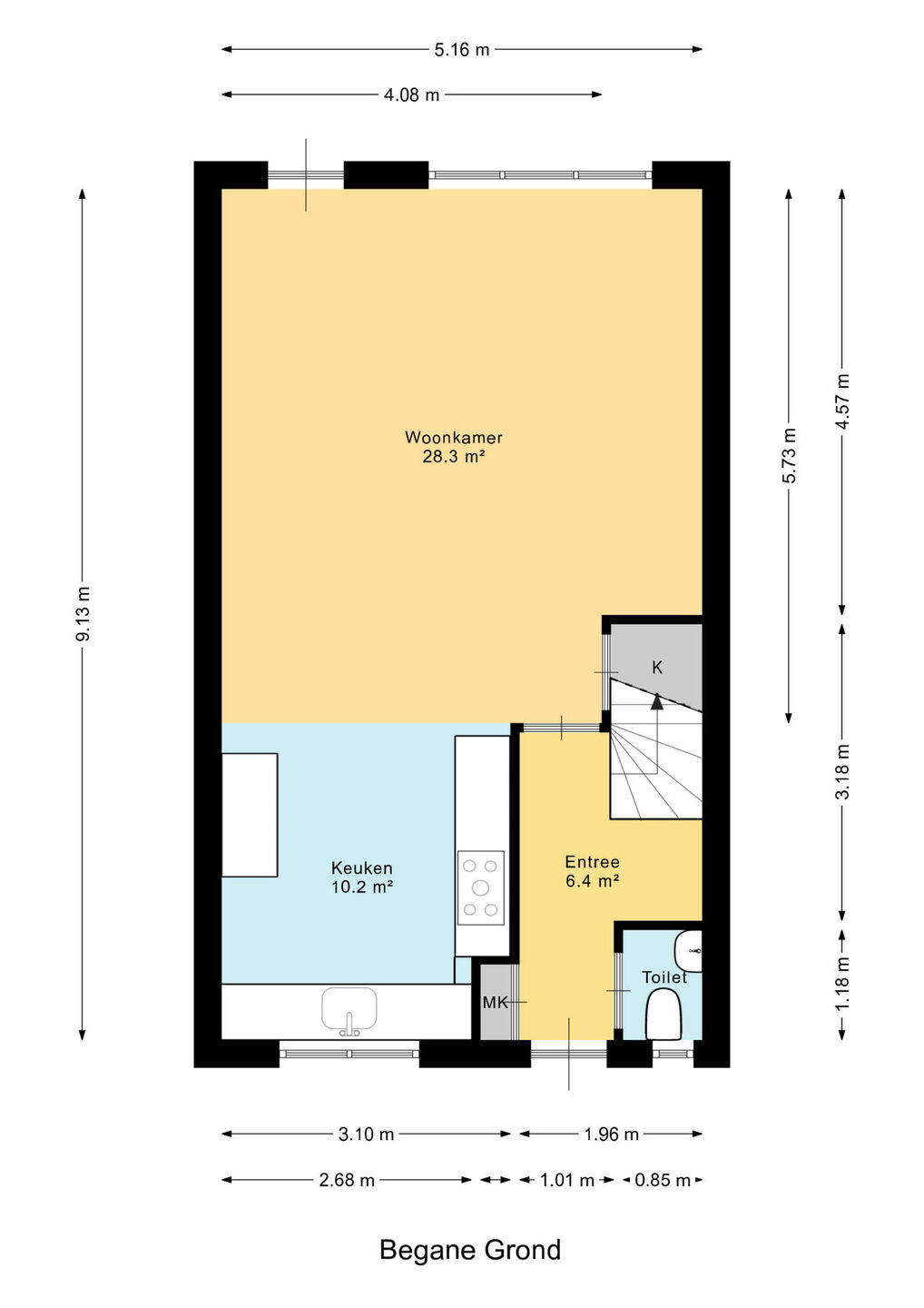 Voortuin met vrijstaande houten berging. Binnenkomst via de voordeur in de ruime entree met de meterkast, het separate toilet met fonteintje (2019), trap naar de eerste verdieping en toegang tot het leefgedeelte.