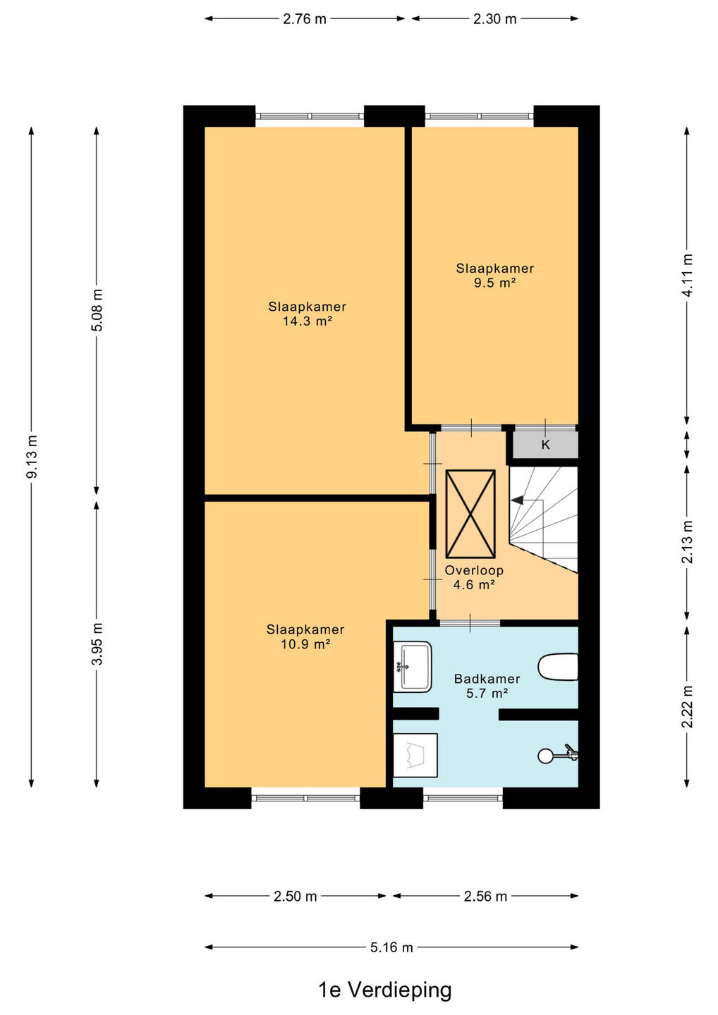 De overloop geeft toegang tot de drie slaapkamers en de badkamer. Twee slaapkamers, waaronder de hoofslaapkamer, zijn gelegen aan de achterzijde. De derde slaapkamer en de badkamer zijn gelegen aan de voorzijde van de woning.