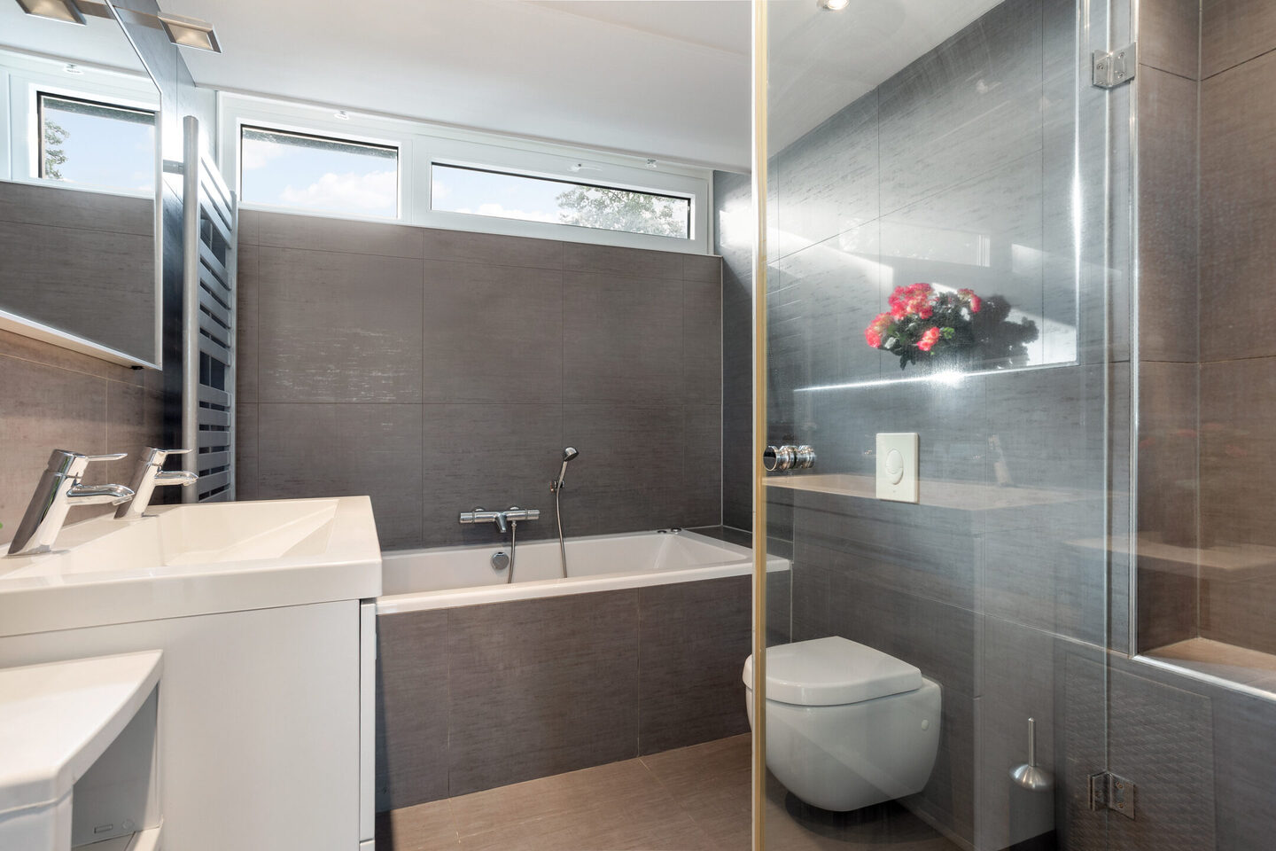 De badkamer is een absolute blikvanger: modern uitgevoerd en van alle gemakken voorzien. De badkamer is uitgerust met een ligbad met jacuzzi functie en handdouche, ruime inloopdouche met hand- en regendouche, dubbele wastafel met verlichte en verwarmde spiegel tegen condensatie, tweede toilet, designradiator, kunstof klepraam met hor voor natuurlijk daglicht en ventilatie.