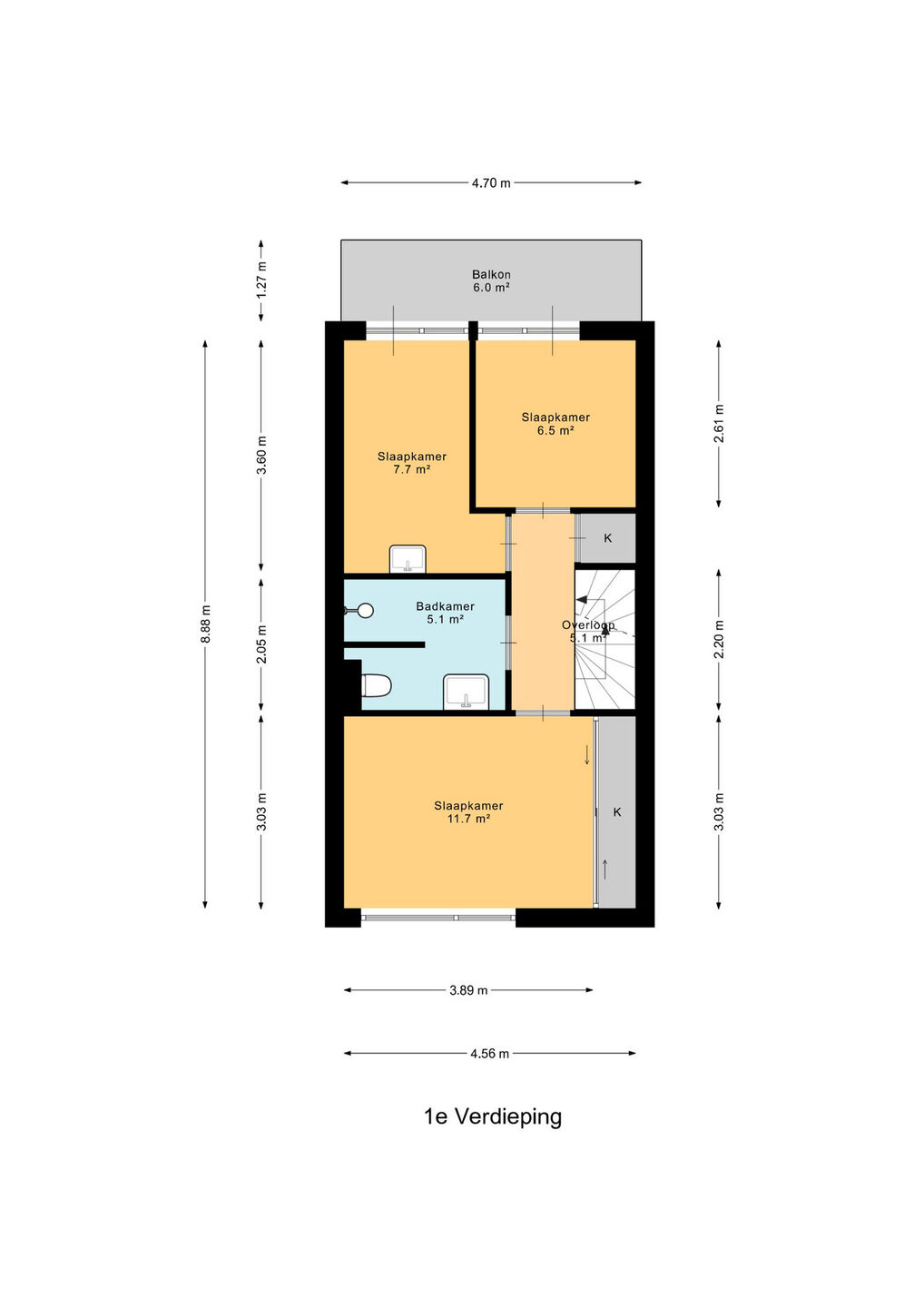 De hoofdslaapkamer is gelegen aan de voorzijde van de woning en beschikt over een vaste inbouwkast. Aan de achterzijde van de woning bevinden zich de twee andere slaapkamers, welke beide toegang bieden tot het balkon.
