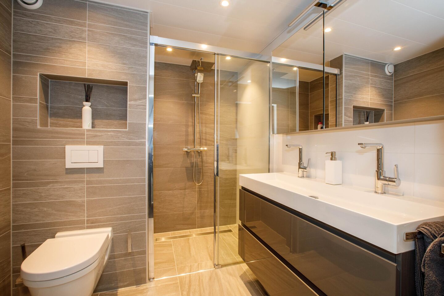 De recent gerenoveerde badkamer is voorzien van een inloopdouche, een toilet, een wastafelmeubel en een designradiator.