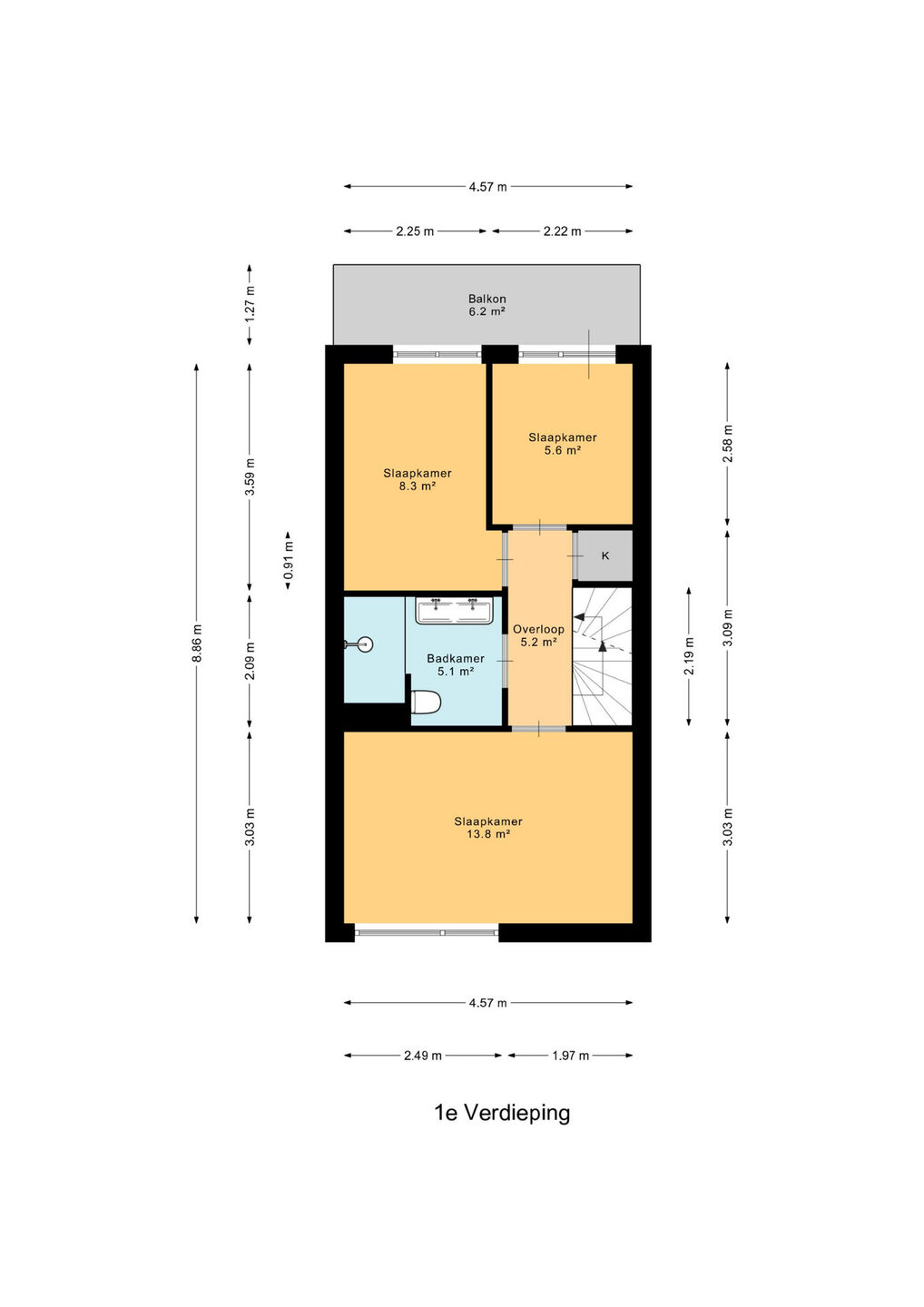 De hoofdslaapkamer ligt aan de voorzijde, de twee overige kamers aan de achterzijde. Eén van deze kamers geeft toegang tot het balkon, eveneens op het zuidwesten gelegen.