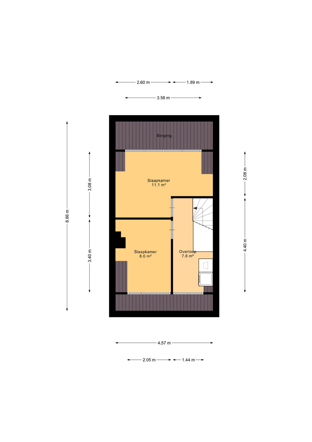 Ruime overloop met opbergruimte achter de knieschotten en aansluitingen voor wasmachine en droger. Dankzij de dubbele dakkapel (kunststof kozijnen, zowel voor als achter) zijn hier nog twee royale slaapkamers gerealiseerd.