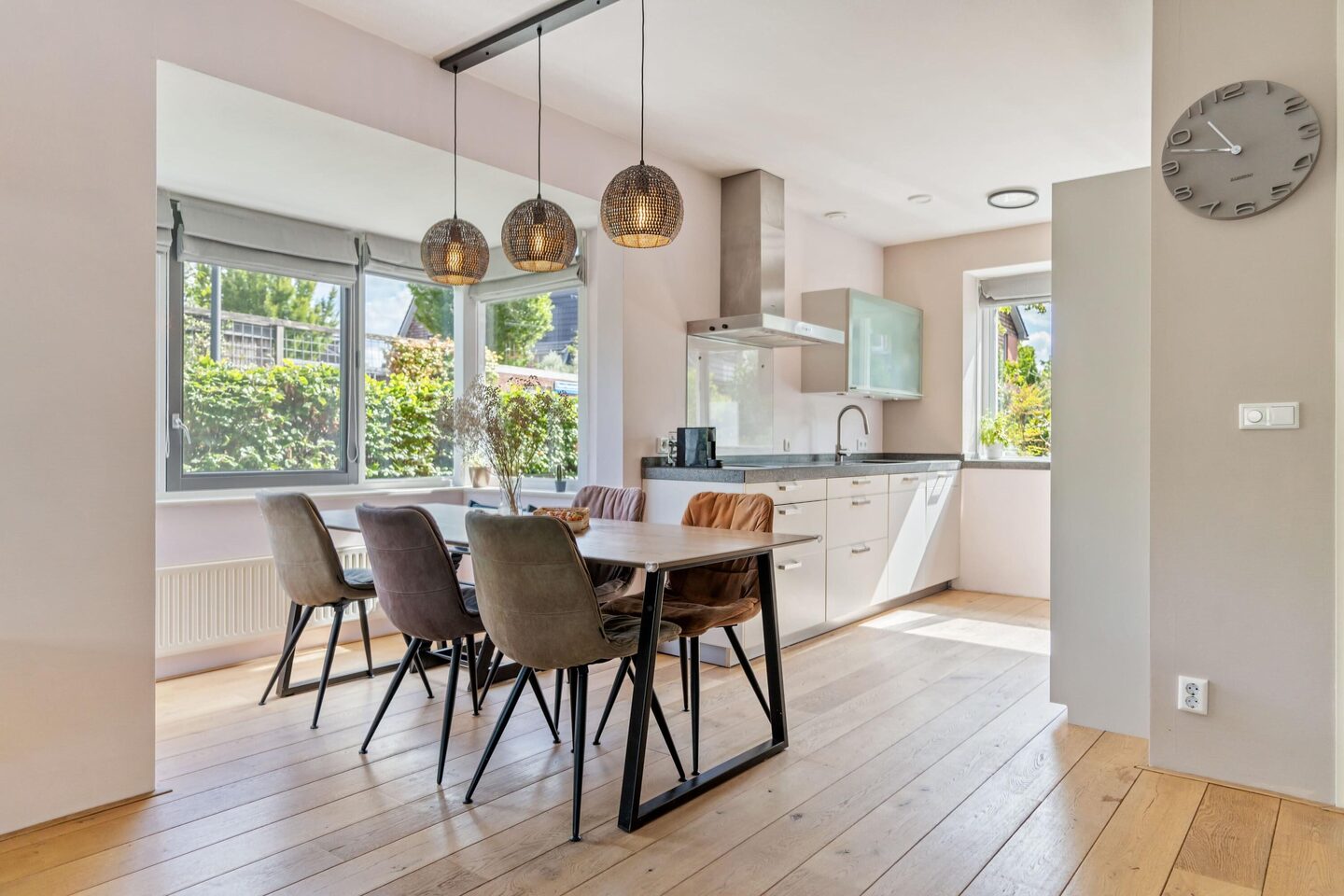 De open keuken bevindt zich aan de voorzijde van de woning en is voorzien van een erker, wat zorgt voor extra licht en een ruimtelijk gevoel. De keuken is uitgerust met diverse inbouwapparatuur, waaronder een inductiekookplaat, afzuigkap, vaatwasser(vernieuwd in 2025), koelkast, vriezer en combimagnetron (ook vernieuwd in 2025).