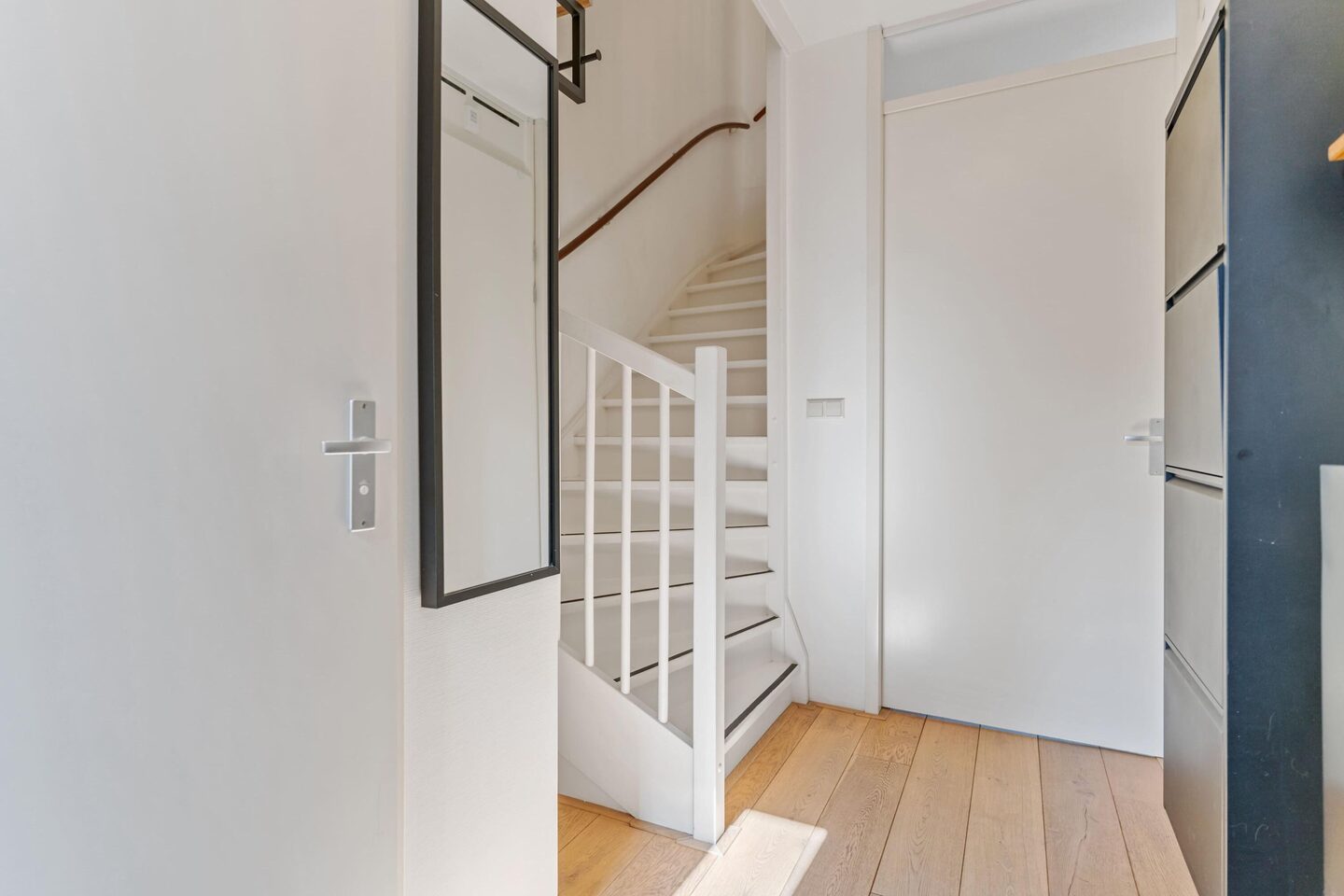Via de entree kom je in de hal met toegang tot het moderne, hangende toilet met fonteintje en de trap naar de eerste verdieping. Vanuit de hal loop je door naar de ruime woonkamer met veel lichtinval en openslaande deuren naar de tuin. Onder de trap is een praktische bergkast aanwezig.