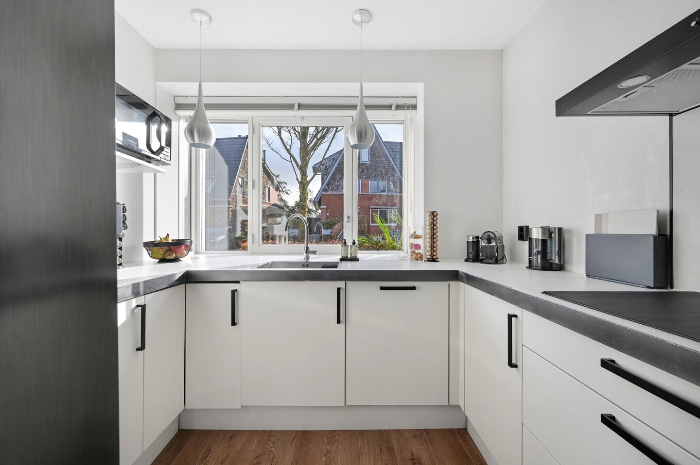 Via de entree kom je in de hal met meterkast, een hangend toilet met fonteintje en de trapopgang naar de eerste verdieping. De woonkamer is heerlijk licht en beschikt over een praktische kast onder de trap en een zijraam met rolluik. Tevens is er aan de achterzijde recent een elektrisch zonnescherm geplaatst. De begane grond is voorzien van een recent gelegde vloer en is strak afgewerkt. Aan de voorzijde bevindt zich de open keuken, uitgerust met diverse apparatuur, waaronder een losse Amerikaanse koel-/vriescombinatie, vaatwasser, keramische kookplaat, afzuigkap en twee losse combi-ovens.