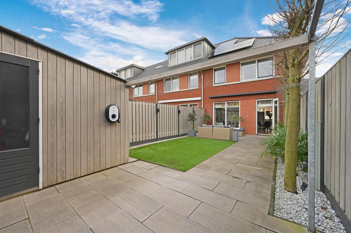 Vanuit de woonkamer bereik je de achtertuin van maar liefst 12,5 meter diep. De tuin is verzorgd aangelegd met kunstgras en een betegeld terras, waardoor je optimaal geniet van het buitenleven. Daarnaast is er een achterom, een praktische berging en parkeergelegenheid op eigen terrein. Ook is er een laadpaal aanwezig. De tuin is gelegen op het westen, waardoor je tot in de late uurtjes kan genieten van de zon.