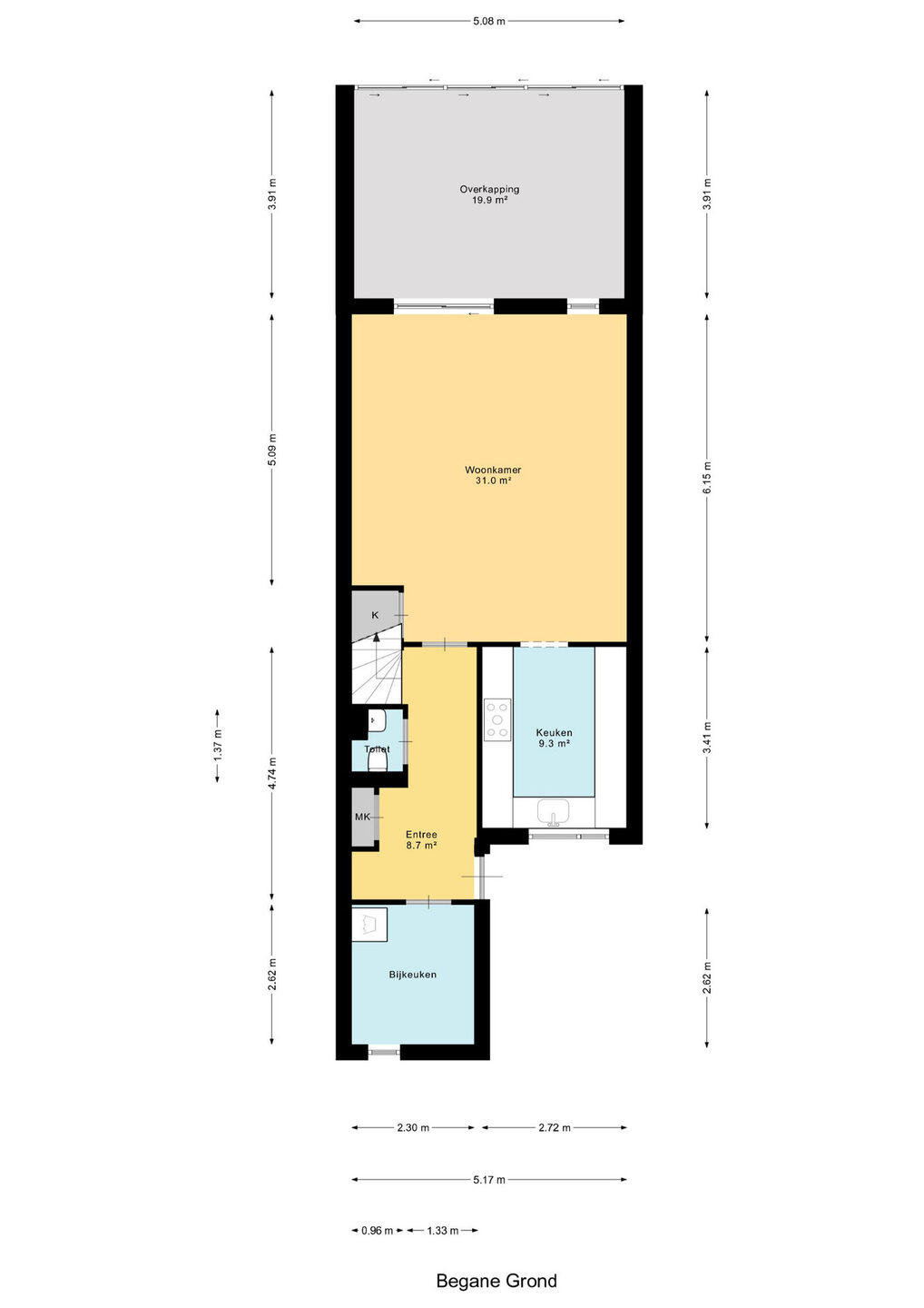 Entree, hal met de meterkast, het toilet (hangend met fonteintje) en de trap naar de eerste verdieping.