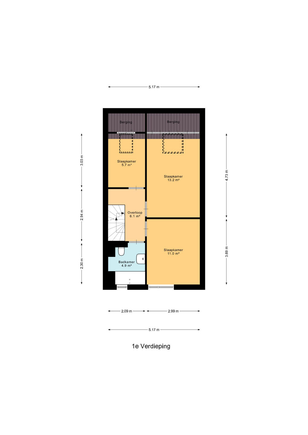 Op deze verdieping bevinden zich drie slaapkamers, waarvan er twee zijn gelegen aan de achterzijde en beide zijn voorzien van een dakraam. De derde slaapkamer is gelegen aan de voorzijde van de woning.