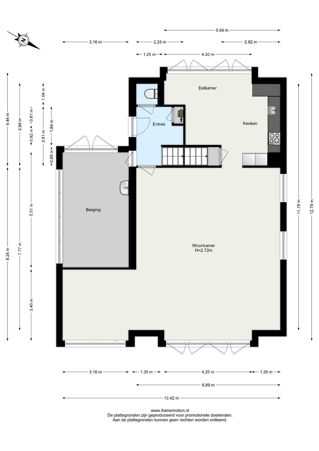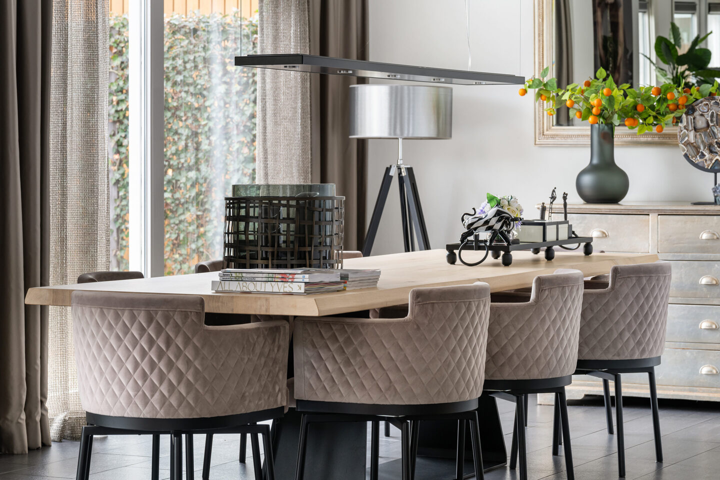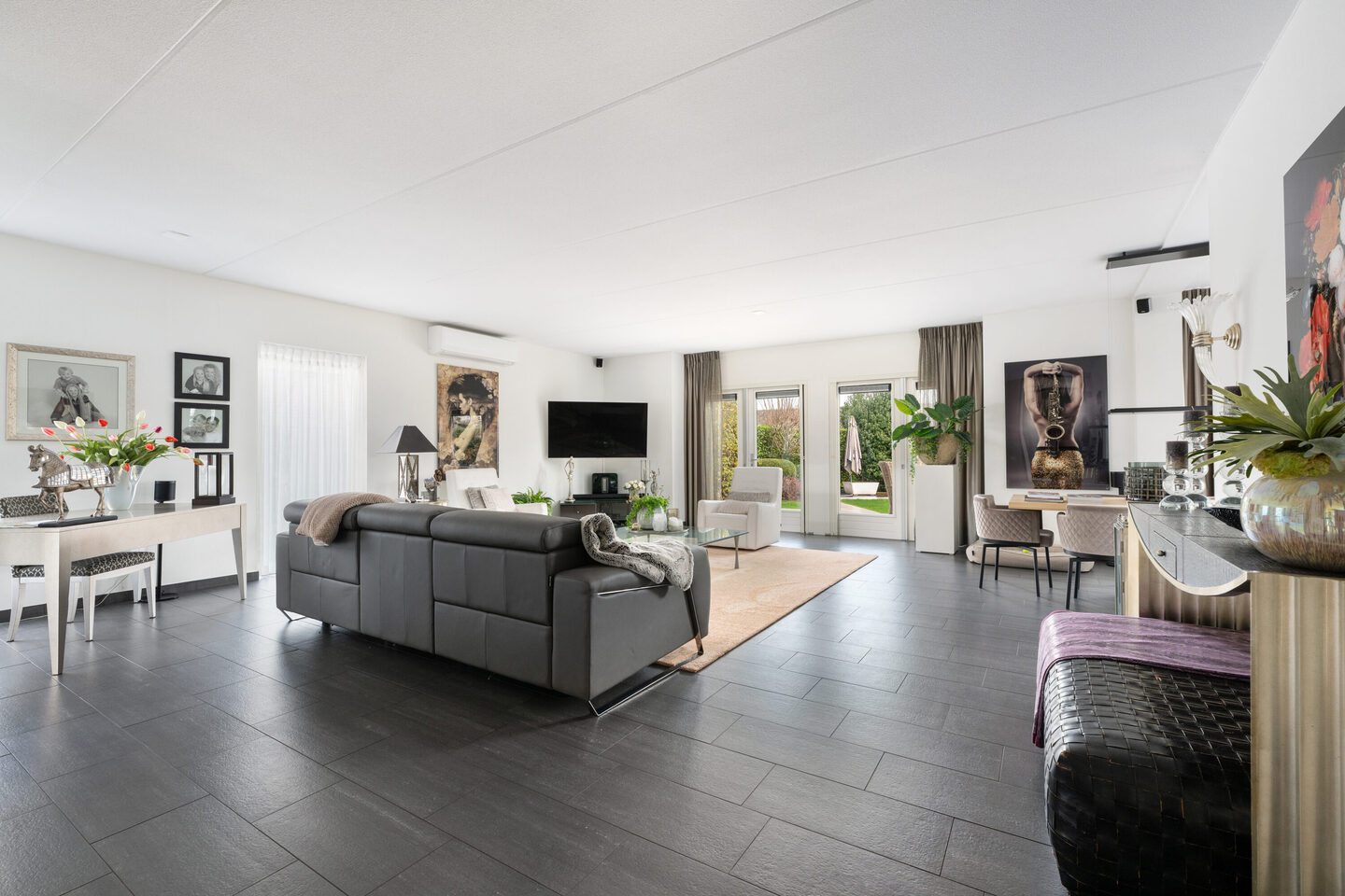 Via de entree kom je in de centrale hal met garderobe, toilet en trapopgang. Vanuit hier is er toegang tot de royale woonkamer, die direct opvalt door de grote afmetingen en de prettige plafondhoogte van circa 2,72 meter. Grote raampartijen en openslaande deuren zorgen voor veel lichtinval en een fijne verbinding met de tuin. De woonkamer biedt volop mogelijkheden voor meerdere zit- en leefhoeken.