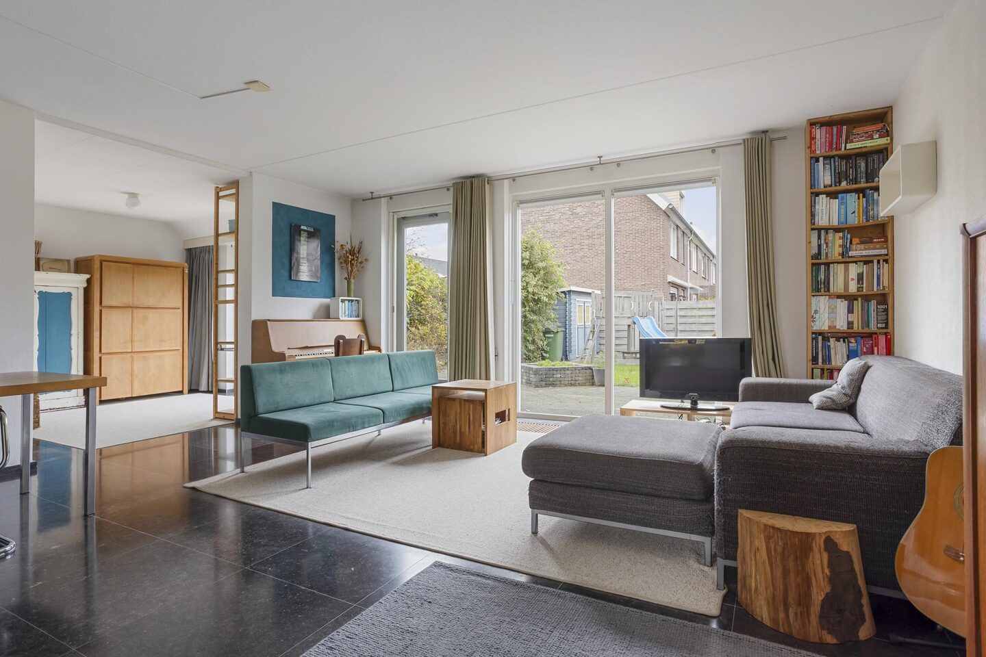 In de woonkamer zorgen de grote raampartijen, de schuifpui en de aparte achterdeur voor een prachtige verbinding tussen binnen en buiten. Vanuit de woonkamer is er directe toegang tot de zonnige tuin, waar je heerlijk kunt ontspannen.