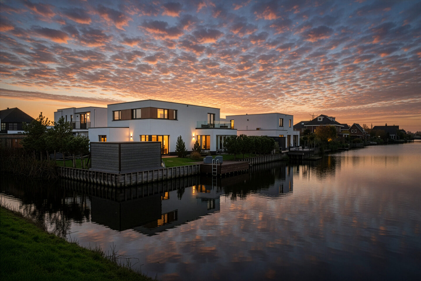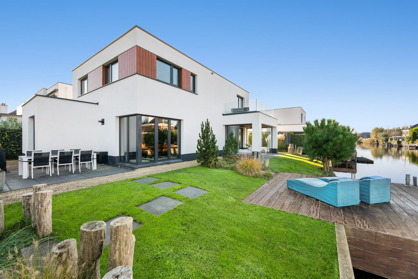De achtertuin is keurig aangelegd en ligt aan het water, wat zorgt voor een vrij en ontspannen gevoel. Je kunt hier op de diverse zitjes zowel in de zon als in de schaduw zitten, en de vlonder maakt het mogelijk om direct aan het water te genieten van een drankje of te vissen. Achterin de tuin bevindt zich een aluminium berging met voldoende ruimte voor fietsen en tuinspullen en er is een grote overkapping aanwezig.