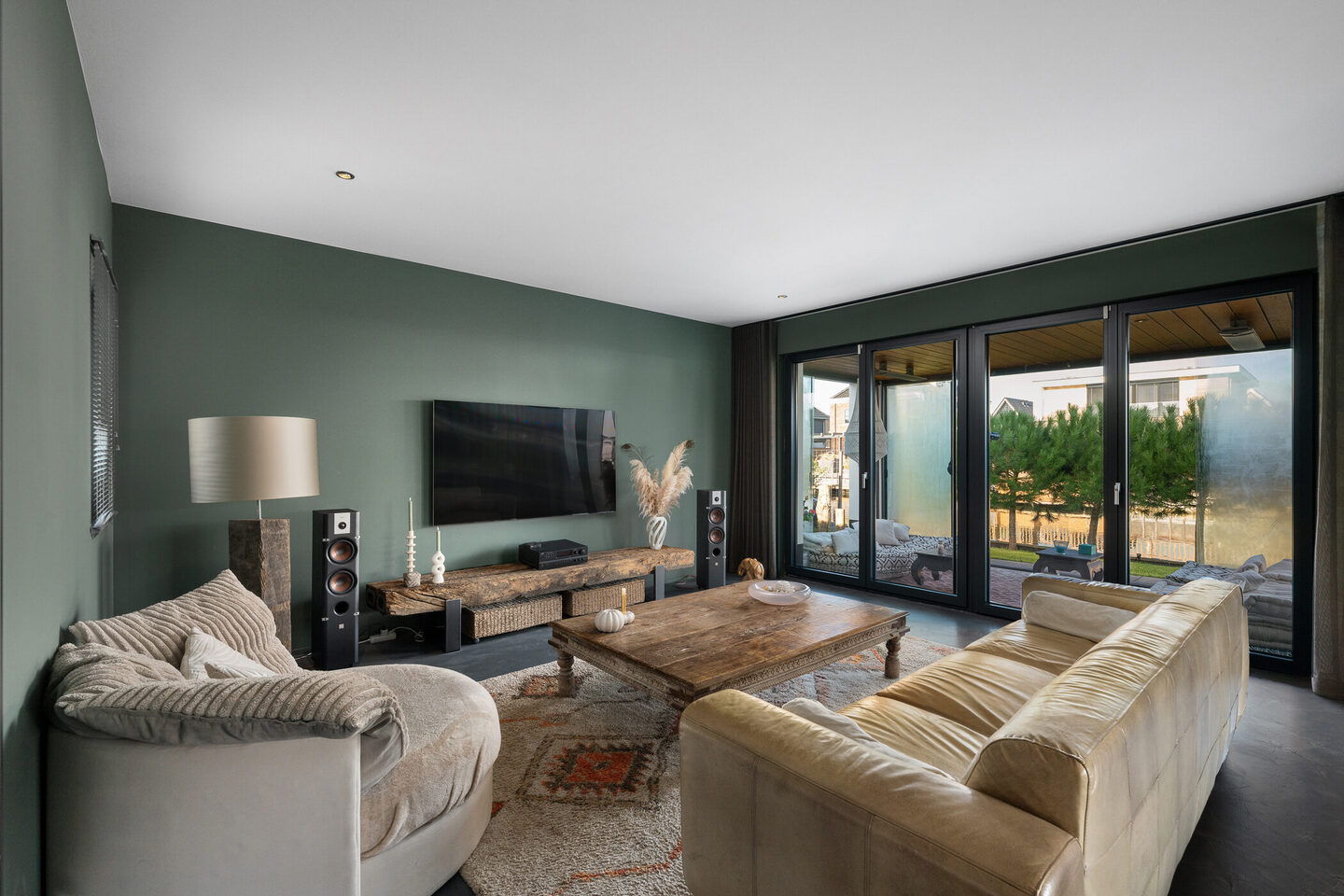 De begane grond is afgewerkt met een moderne gietvloer (beton ciré, gehele woning), glad gestuukte wanden (en plafond) en stoere kleuren die zorgen voor een eigentijdse uitstraling. Een echte eyecatcher is de gashaard.