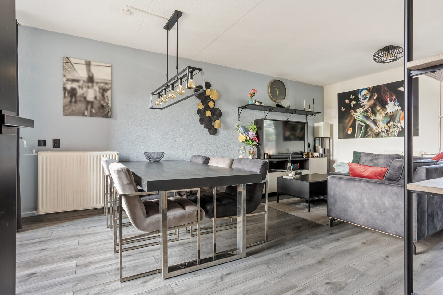 Vanuit de hal betreedt u de lichte woonkamer met een gezellig zit- en eethoek. De woonkamer is in 2023 voorzien van een nieuwe laminaatvloer. Aan de voorzijde van het appartement bevindt zich de moderne open keuken (2023) welke is voorzien van een 4-pits inductiekookplaat, een afzuigkap, een koel/vriescombinatie, een vaatwasser en een oven. Het balkon is te bereiken via de schuifpui in de woonkamer en is gesitueerd op het zuidoosten.