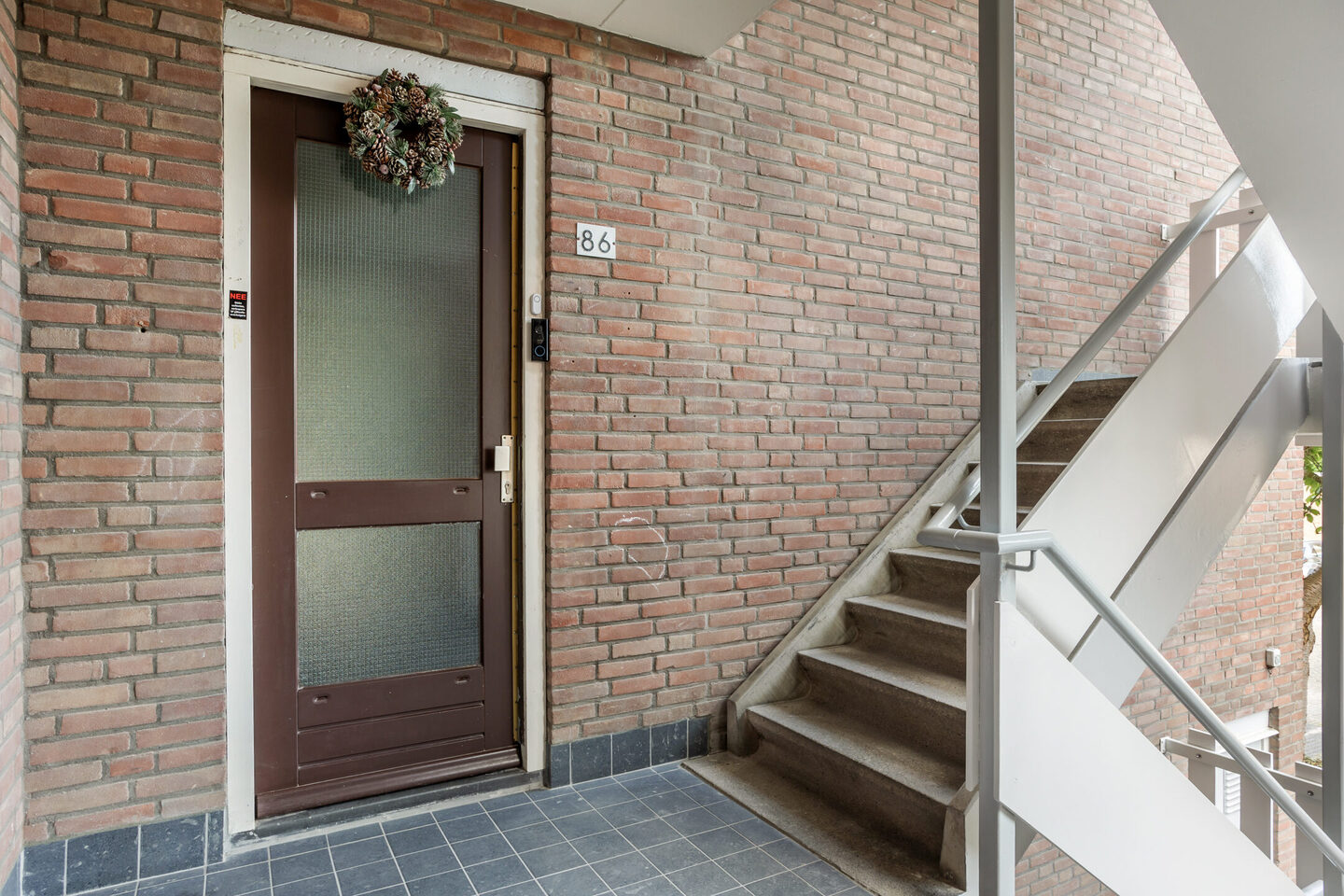 Open portiek met brievenbussen en het trappenhuis. Op de begane grond is een berging aanwezig.