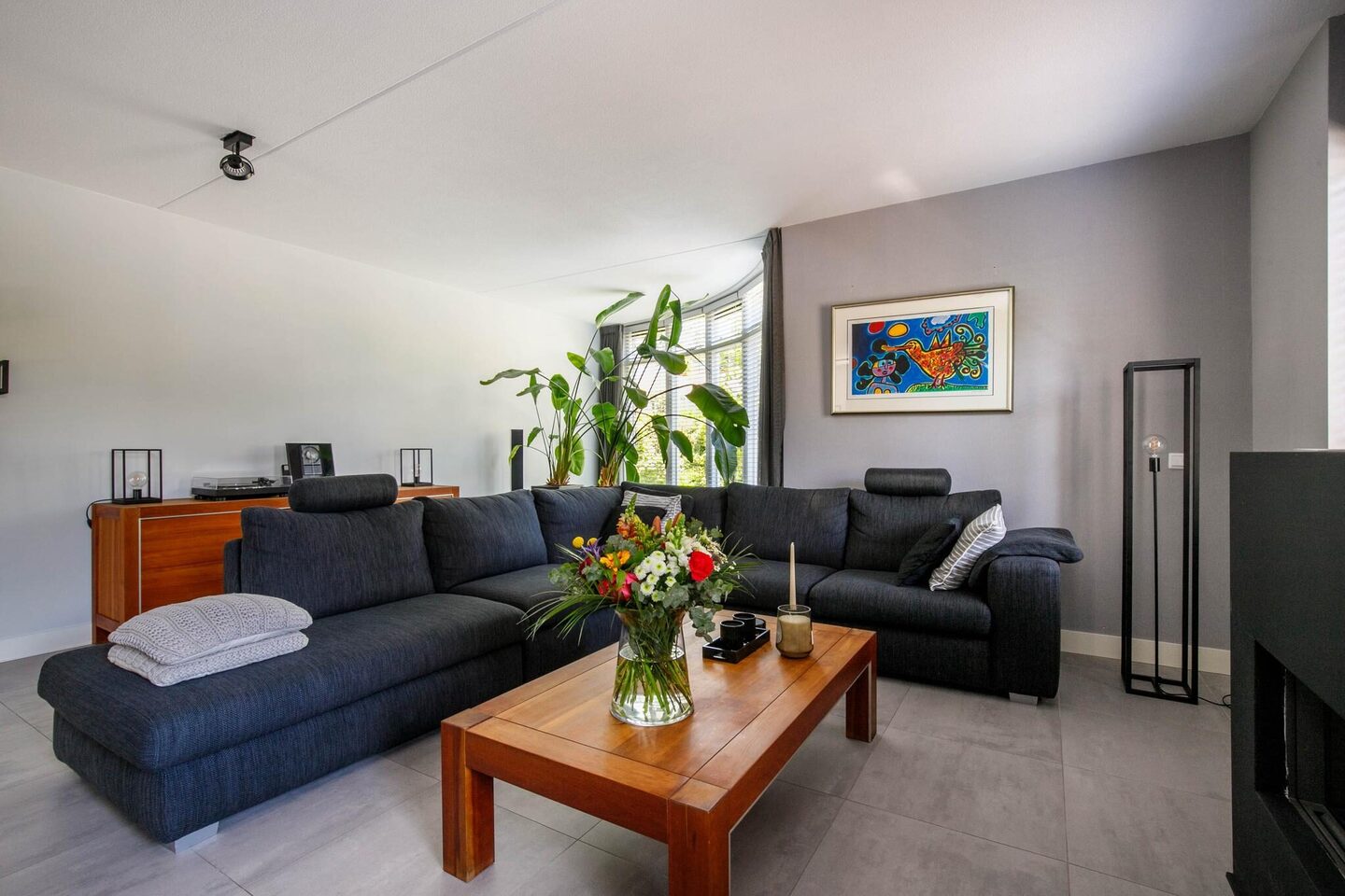 Het huis beschikt over een grote woonkamer met aan de voorzijde een ronde serre en het zitgedeelte met een gashaard en aan de achterzijde het eetgedeelte. Vanuit de eetkamer is er een dubbele deur naar het terras en de tuin.
