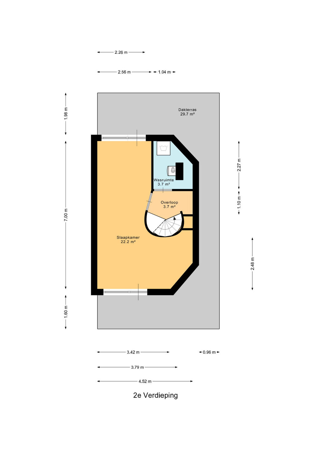 Ruime vierde slaapkamer van ca. 22 m² met veel lichtinval en toegang tot het royale dakterras van bijna 30 m². Tevens is hier een wasruimte aanwezig.