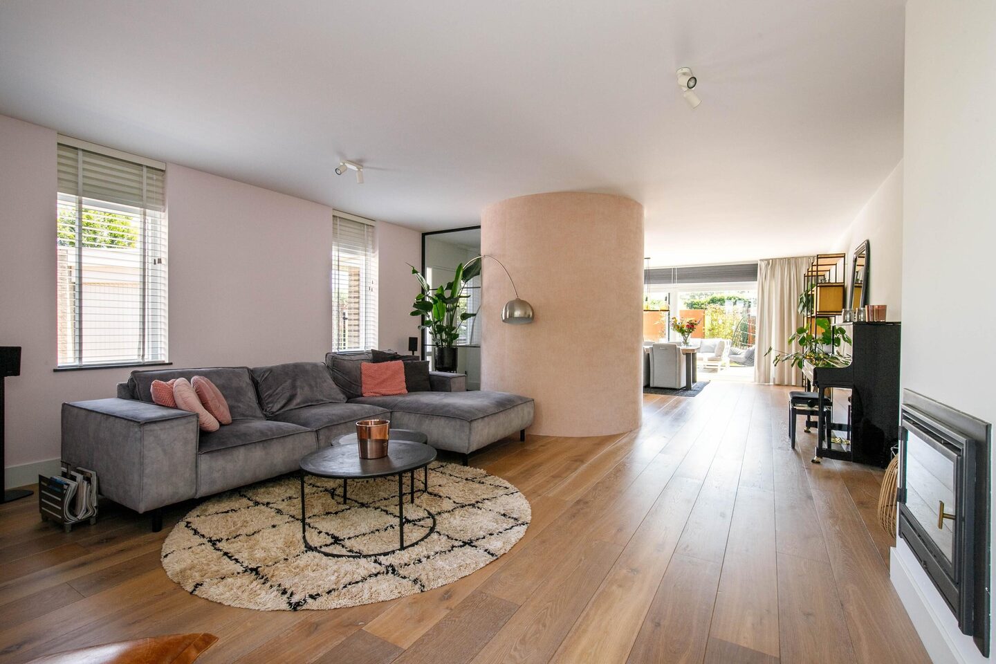 De grote woonkamer is aan de achterzijde voorzien van een open keuken in de voormalige bijkeuken voorzien van een tegelvloer. Verder is de keuken voorzien van alle denkbare apparatuur zoals een koelkast, een combi oven (zelfreinigend), een vriezer en een Bora inductiekookplaat met afzuigkap. Heel tof is het werkblad van gezoet marmer. In het eetgedeelte is een airco aanwezig en de tuin is zowel via een deur als via een schuifpui te bereiken. Zon wordt uit de kamer gehouden door een zonnescherm.
