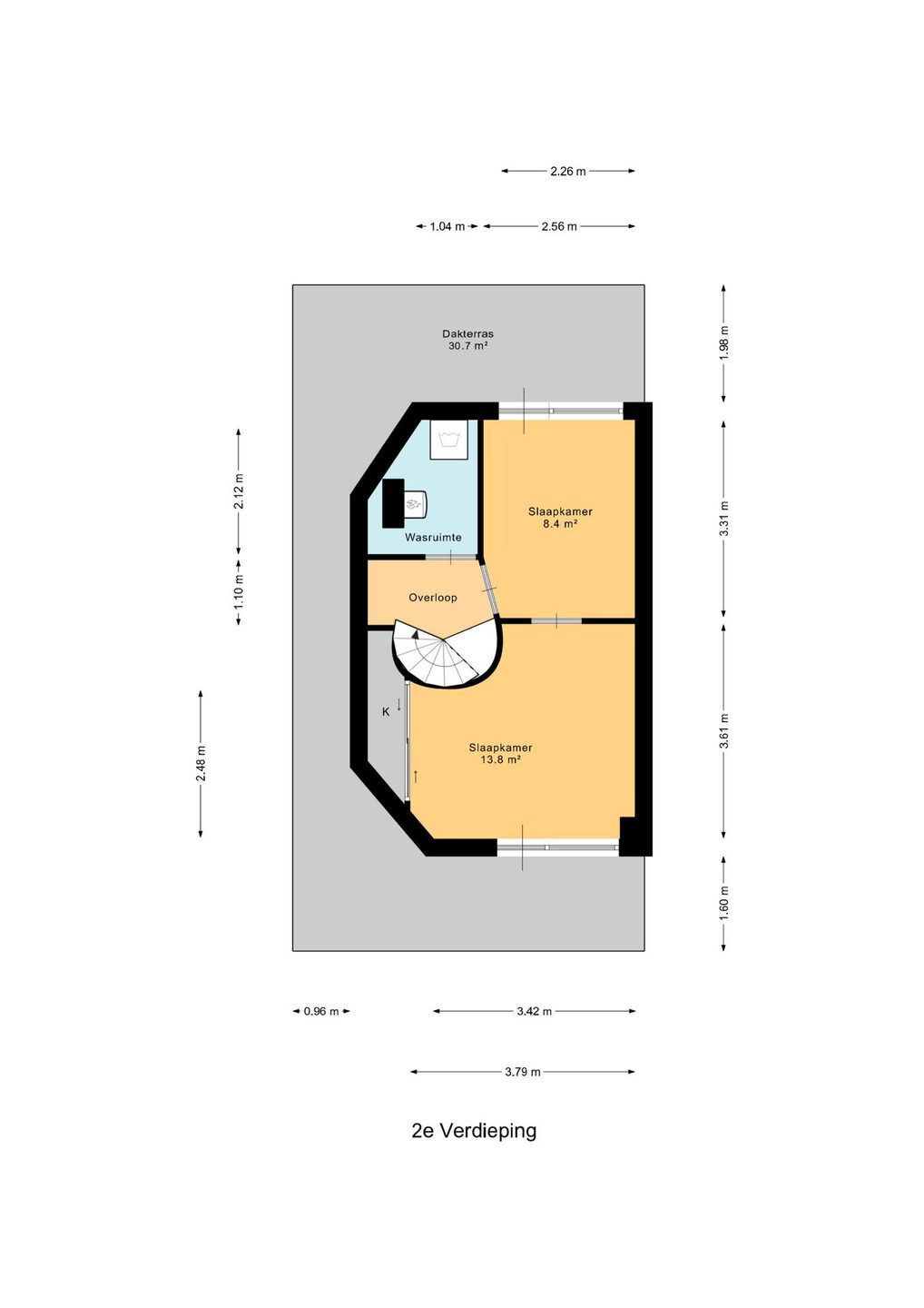 Overloop met een technische ruimte met daarin de CV en de wasmachineaansluiting. Slaapkamer aan de achterzijde met een deur naar het dakterras en een deur naar de slaapkamer aan de voorzijde welke is voorzien van een vaste schuifwandkast en een deur naar het dakterras. Ook deze verdieping is geheel voorzien van stuukwerk.