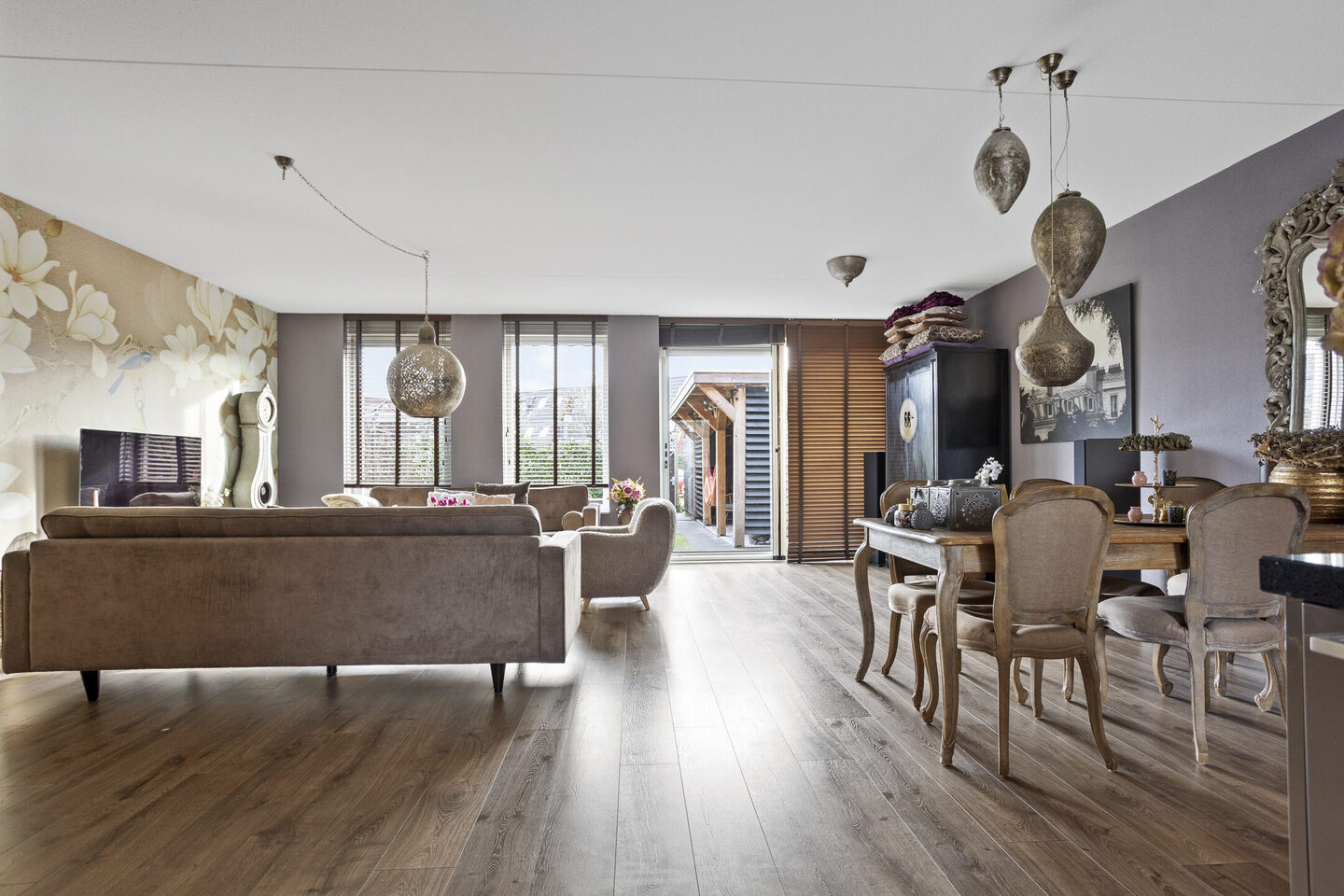 Vanuit de hal heeft u toegang tot de ruime woonkamer met een open keuken aan de voorzijde van de woning. Wat direct opvalt is de breedte van de woning. De woning is namelijk bijna 7 meter breed. Het zitgedeelte bevindt zich aan de achterzijde van de woning. Via een schuifpui is de achtertuin bereikbaar. De achtertuin beschikt over een ruime overkapping van hoogwaardige kwaliteit en een houten berging. Er is een achterom welke leidt tot de eigen parkeerplaats. De achtertuin is gelegen op het zuidoosten.