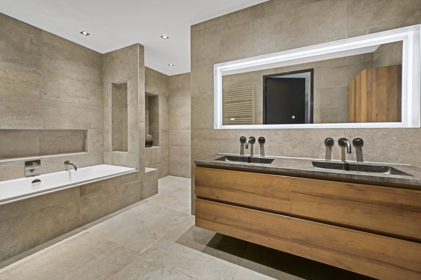 De vergrote badkamer is modern en luxe uitgevoerd en van alle gemakken voorzien. Zo beschikt deze over een dubbel wastafelmeubel met ingebouwde kranen, een verlichte spiegel, een ligbad, een ruime inloopdouche met sunshower en een elektrische designradiator.
