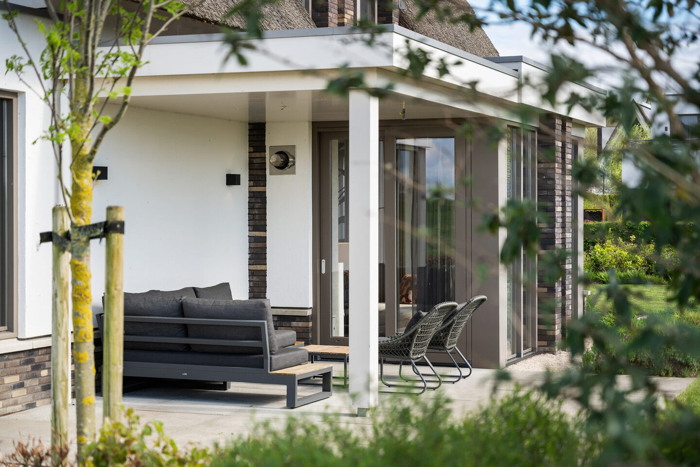 Via dubbele deuren stap je vanuit de keuken zo de tuin in. Het zitgedeelte is gesitueerd aan de andere zijde van de leefruimte, rondom een sfeervolle gashaard. Aansluitend bevindt zich de onderheide veranda – een beschutte en comfortabele plek om vrijwel het hele jaar buiten te zitten.